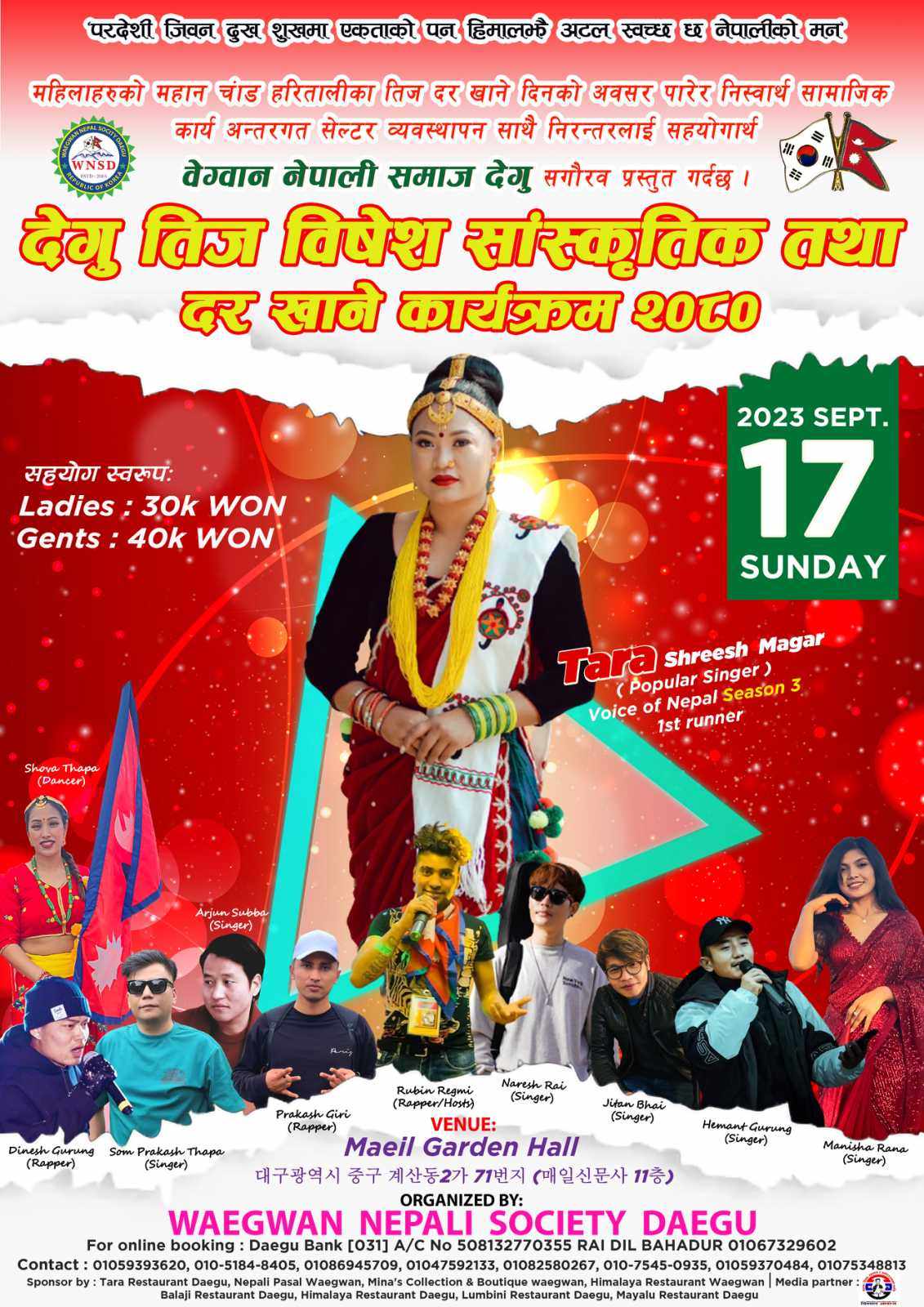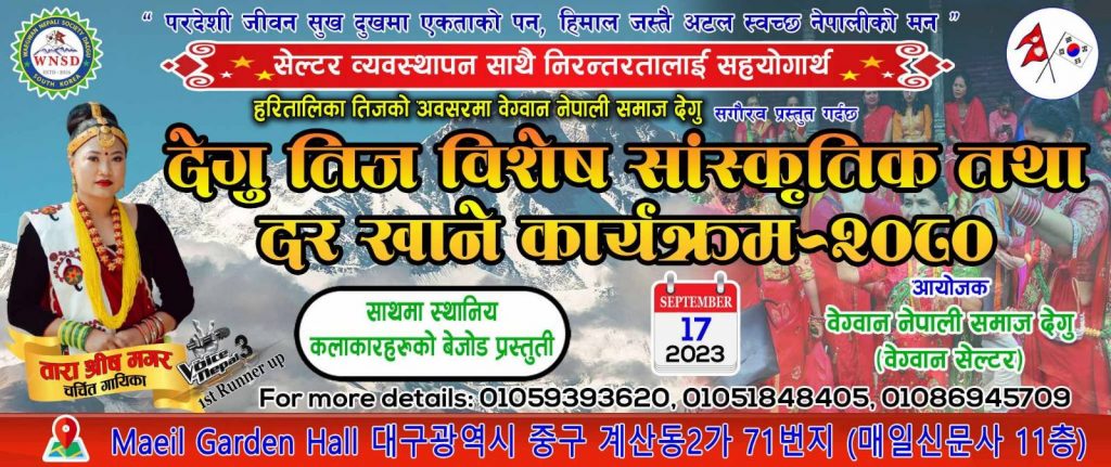 मीन बि क, सौल दक्षिण कोरिया:नेपाली महिलाहरूको महान पर्व हरितालिका तिजको उपलक्ष्यमा वेग्वान नेपाली समाज थेगुले सांस्कृतिक तथा दर खाने कार्यक्रम आयोजना गर्ने भएको छ ।