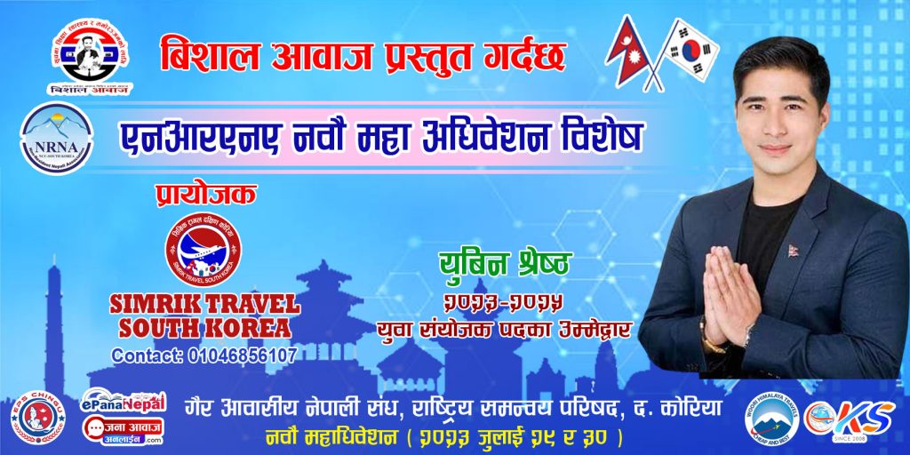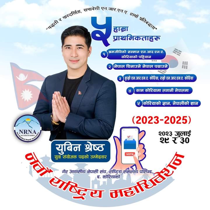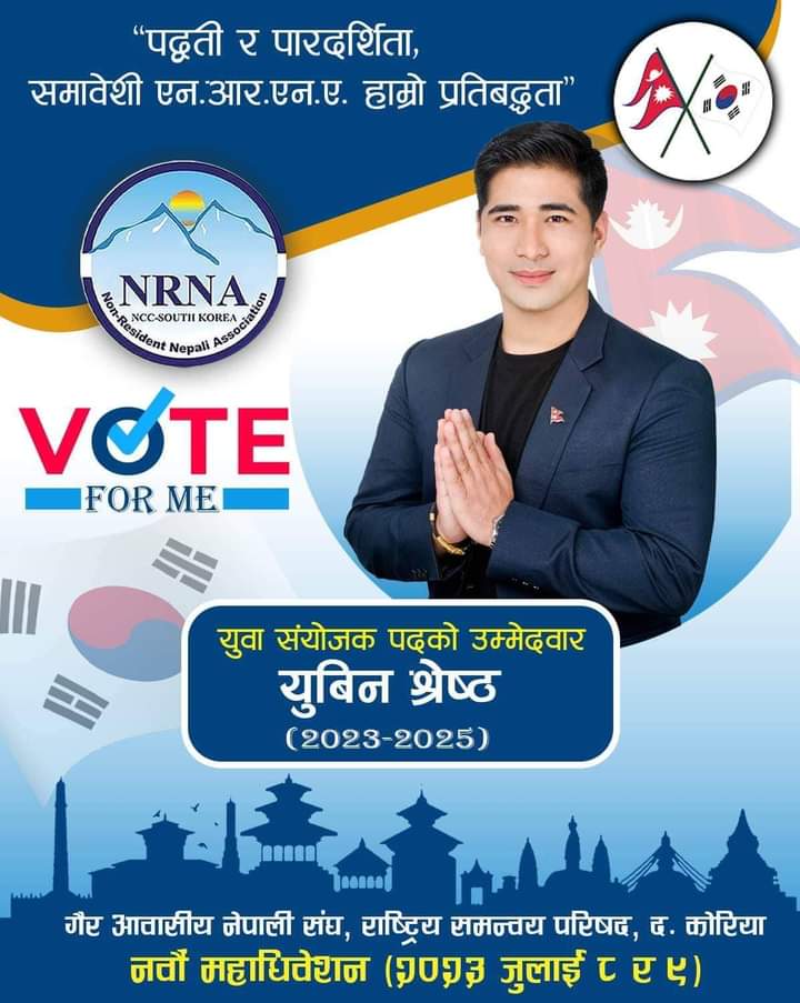 विशाल श्रेष्ठ/दक्षिण कोरिया:गैर आवासीय नेपाली संघ कोरियाको आगामी दुई बर्ष( २०२३-२०२५)का लागि नयाँ संगठनमा नयाँ नेतृत्व चयन गर्ने बेला भएकोले नेतृत्व लिन चाहाने एनआरएनहरुको दौडधुप, प्रचार-प्रसार र लविङ तीब्र बन्दै गएको छ ।आगामी आउदो जुलाइ २९/३० तारिख मा हुन गइरहेको गैर आवासीय नेपाली संघ कोरिया(एनआरएनए दक्षिण कोरिया) को नवौ महाअधिवेशनको लागि दक्षिण कोरियामा अफिसियल रुपमा दर्ता भएको इभेन्ट म्यानेजमेन्ट कम्पनी KTM2SEOUL का सन्चालक युविन श्रेष्ठले बिपिन गुरुङको प्यानलबाट उम्मेदवारि दर्ता गरे लगत्तै चुनावको गर्मि पनि कोरियाको गर्मि जत्तिकै ह्वात्तै बढेको छ।