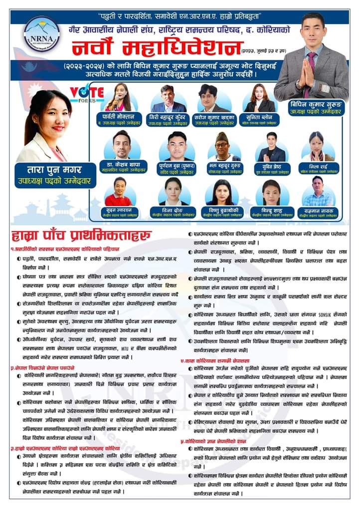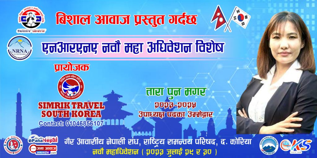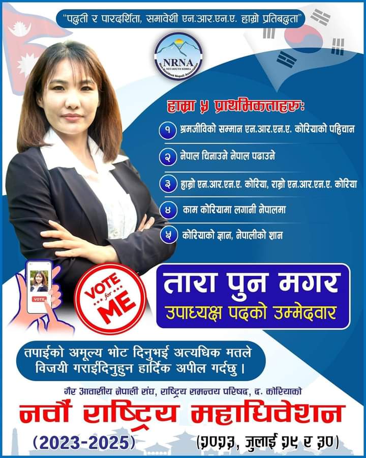 विशाल श्रेष्ठ/दक्षिण कोरिया:आगामी आउदो जुलाइ २९/३० तारिख मा हुन गइरहेको गैर आवासीय नेपाली संघ कोरिया(एनआरएनए दक्षिण कोरिया) को नवौ महाअधिवेशनको सरगर्मी वढे संगै तारा पुन मगर ले खुल्ला उपाध्यक्ष पदमै उम्मेदवारी दिए पछि चुनावि रौनक झनै रोचक बन्ने देखिएको छ।