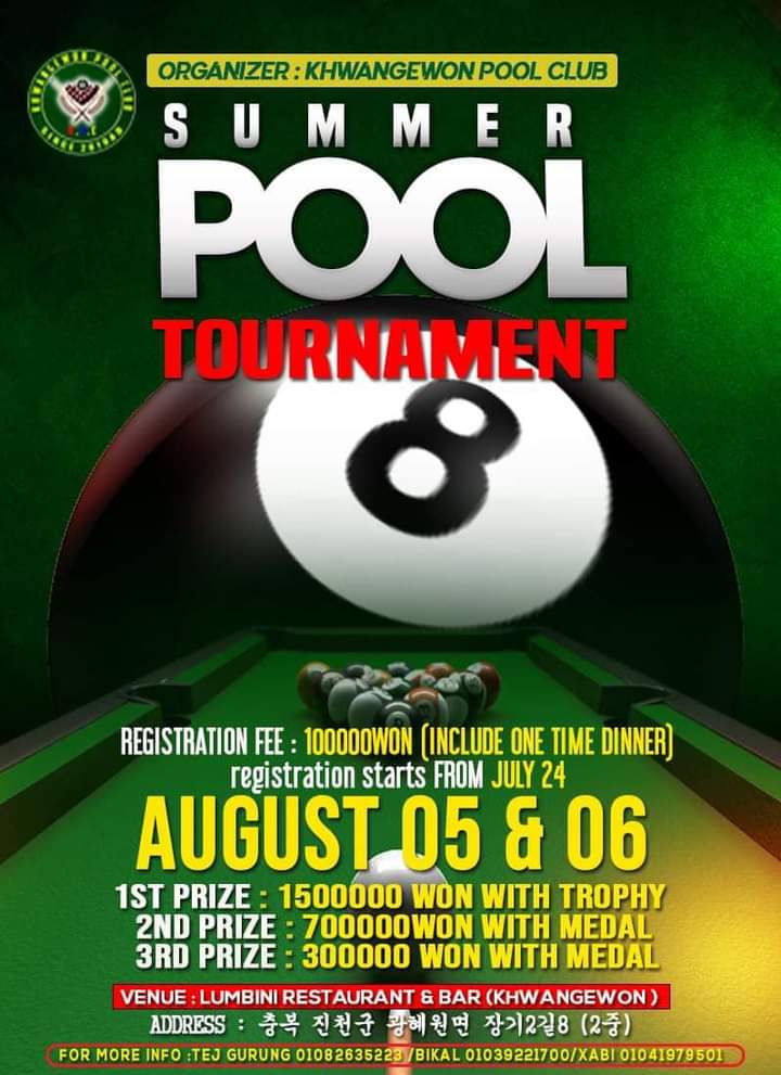 लुम्बिनि रेस्टुरेन्ट एण्ड बार (KHWANGEWON) 충복 진천군 광해원면 장기 2길8 (2층) मा KHWANGEWON POOL CLUB को आयोजनामा अगस्ट ५/६ मा हुन गइरहेको SUMMER POOL TOURNAMENT मा प्रथम हुने ले १५ लाख वन नगद र साथमा ट्रफी पुरस्कार पाउनेछ भने सेकेण्ड र थर्ड हुनेले क्रमशः ७ लाख वन र ३ लाख वन नगद सहित ट्रफि पुरस्कार पाउनेछन्। प्रतियोगितामा सहभागी हुनको लागि जुलाइ २४ वाट फर्म खुलेको र रजिष्ट्रेसन फि one time dinner सहित १ लाख वन तोकिएको आयोजकले बताएको छ।