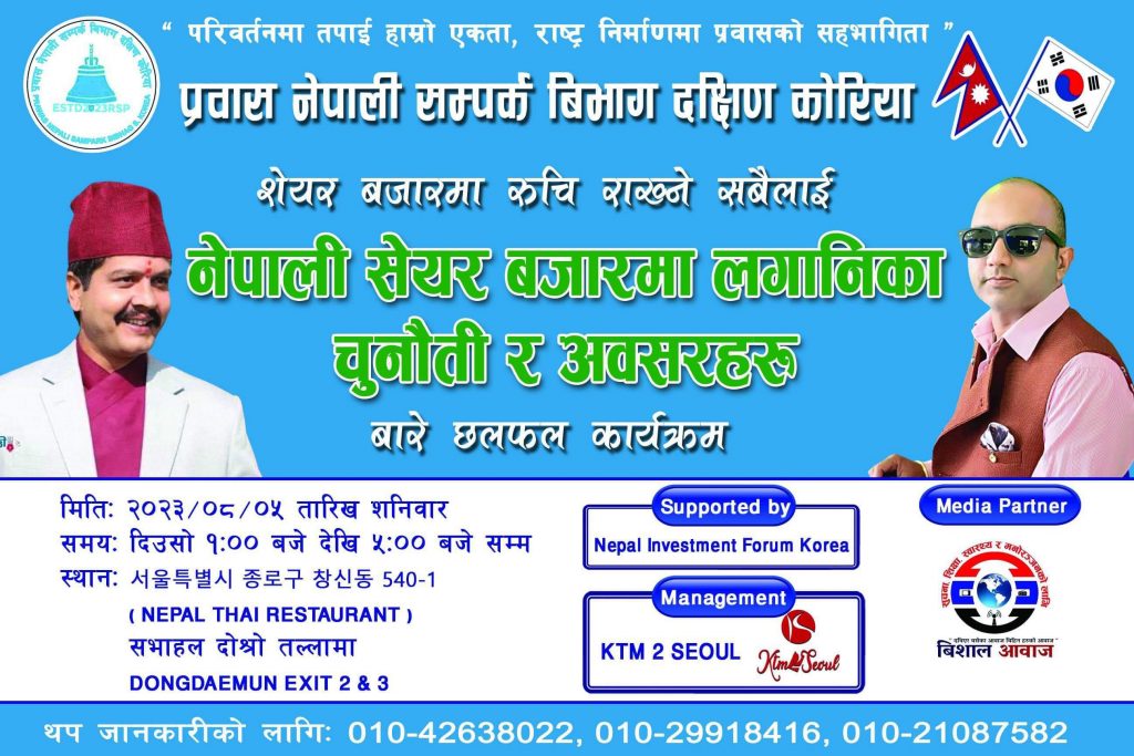 KTM 2 SEOUL इभेन्ट म्यानेजमेन्ट कम्पनीले व्यवस्थापन गर्ने सेयर बजारका चुनौती र अवसर वारे लगानीकर्ताले ध्यान दिनुपर्ने कुराहरु लगायतका विषयहरुमा प्रशिक्षण तथा छलफल कार्यक्रम 서울특별시 종로구 창신동 540-1 ( NEPAL THAI RESTAURANT )को सभाहल दोश्रो तल्ला (🚇 𝑺𝑼𝑩𝑾𝑨𝒀 : DONGDAEMUN EXIT 2 & 3 को विचमा)मा हुने आयोजकले जनाएको छ। पहिलो सेसनमा वक्ताहरुको भनाई र दोस्रो सेसनमा भने प्रश्न उत्तर गर्न पाउने कार्यक्रम पनि रहेको हुदा कार्यक्रममा शेयरबजारसँग सम्बन्धित कारोबार गर्ने तथा बुझ्न खोज्ने सम्पूर्ण आम नेपाली दाजुभाई तथा दिदीबहिनीहरुले आफ्ना जिज्ञासाहरु प्रश्नहरु निर्धक्कसँग राख्न पाइने छ।यस्ता कार्यक्रमले कोरियामा रहेका नेपालीहरुले नेपालमा रहेको शेयरबजारमा आफ्नो लगानी सुरक्षित गर्दै portfolio बढाउनका लागि मद्दत मिल्ने आयोजकले अपेक्षा राखेको छ।