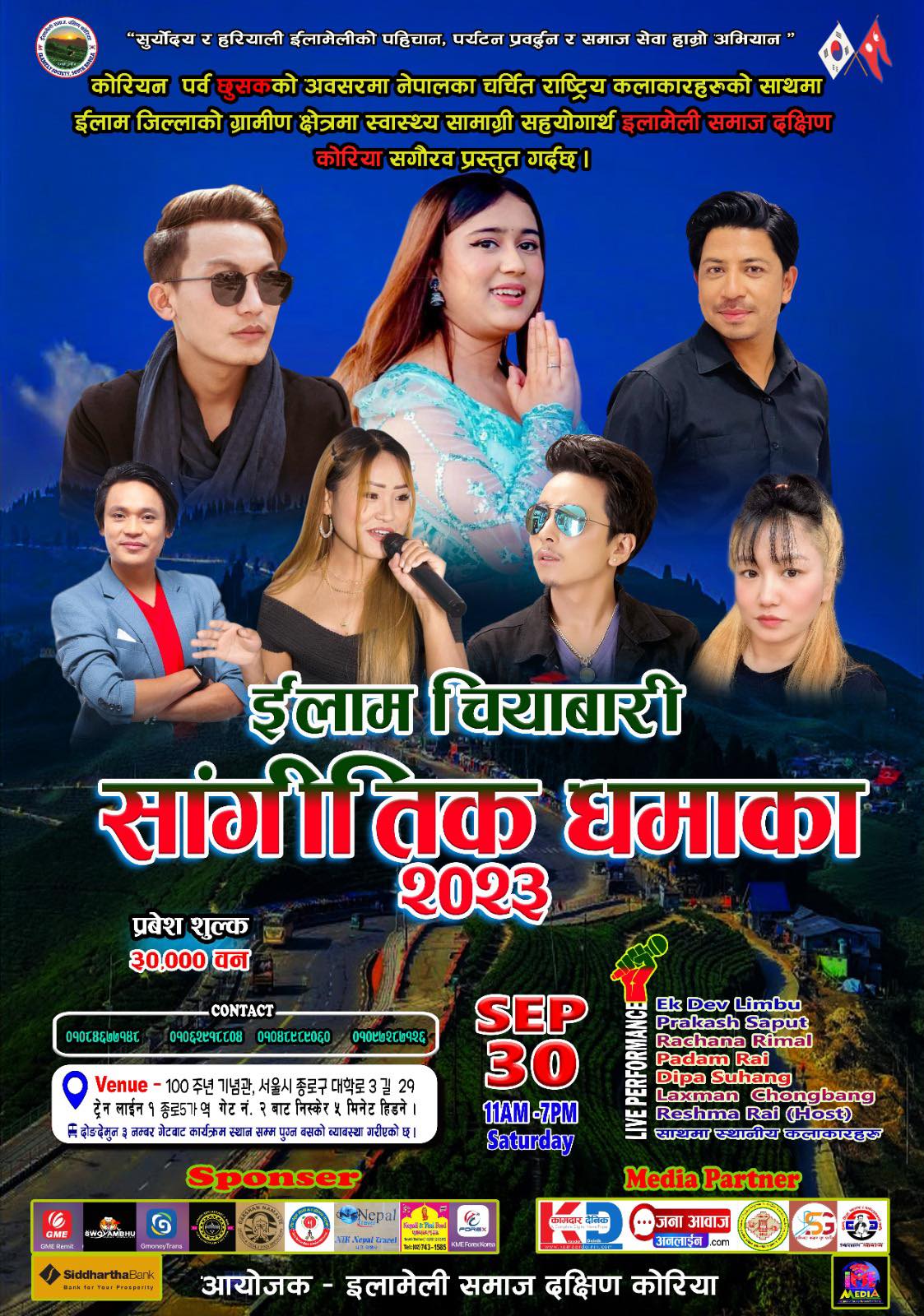 सउल दोङ्देमुन स्थित निक नेपाल ट्राभल को सभाहलमा आयोजित पोष्टर सार्वजनिक कार्यक्रममा विभिन्न संघसंस्था लगायत पत्रकार हरुको बाक्लो उपस्थिति रहेको थियो। सेप्टेम्बर ३० तारिख ११ बजे वाट साझ ७ बजे सम्म हुने इलाम चियाबारी सांगितिक धमाका २०२३ मा नेपालको चर्चित राष्ट्रिय कलाकार हरु एकदेव लिम्बु,प्रकाश सपुत,रचना रिमाल लगायत पदम राइ,दिपा सुहाङ्ग लक्ष्मन चोङबाङ र साथमा रेश्मा राइले सन्चालन गर्ने कार्यक्रममा स्थानिय कलाकारहरुले बेजोड प्रस्तुती रहने आयोजकले जनाएको छ। 100주년 기념관 서울시 종로구 대학로 3 길 29 ट्रेन लाइन १ 종로5 가역 गेट न २ बाट निस्केर ५ मिनेट हिँडेर पुग्न सक्ने (दोङ्देमुन ३ नम्बर गेटबाट कार्यक्रम स्थान सम्म पुग्न बसको व्यबस्था गरिएको) हलमा आयोजना हुने इलाम चियाबारी सांगितिक धमाका २०२३ को प्रवेश शुल्क ३०००० वन तोकिएको छ। नेपाल सम्पर्क समिति दक्षिण कोरिया द्वारा आयोजित कार्यक्रम वाडफाड कार्यक्रममा छूसकको तेश्रो दिन सेप्टेम्बर ३० तारिक पूर्वाञ्चल सरोकार समाज अन्तर्गत इलामेली समाजले कार्यक्रम गर्ने प्रस्ताव इलामेली समाज दक्षिण कोरियाको अध्यक्ष टिका थेगिम ले लानु भएपश्चात त्यहा वाट पारित भएर कार्यक्रम गर्ने अनुमति पाएको थियो।