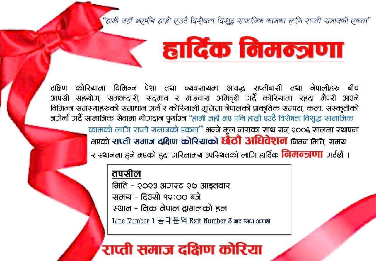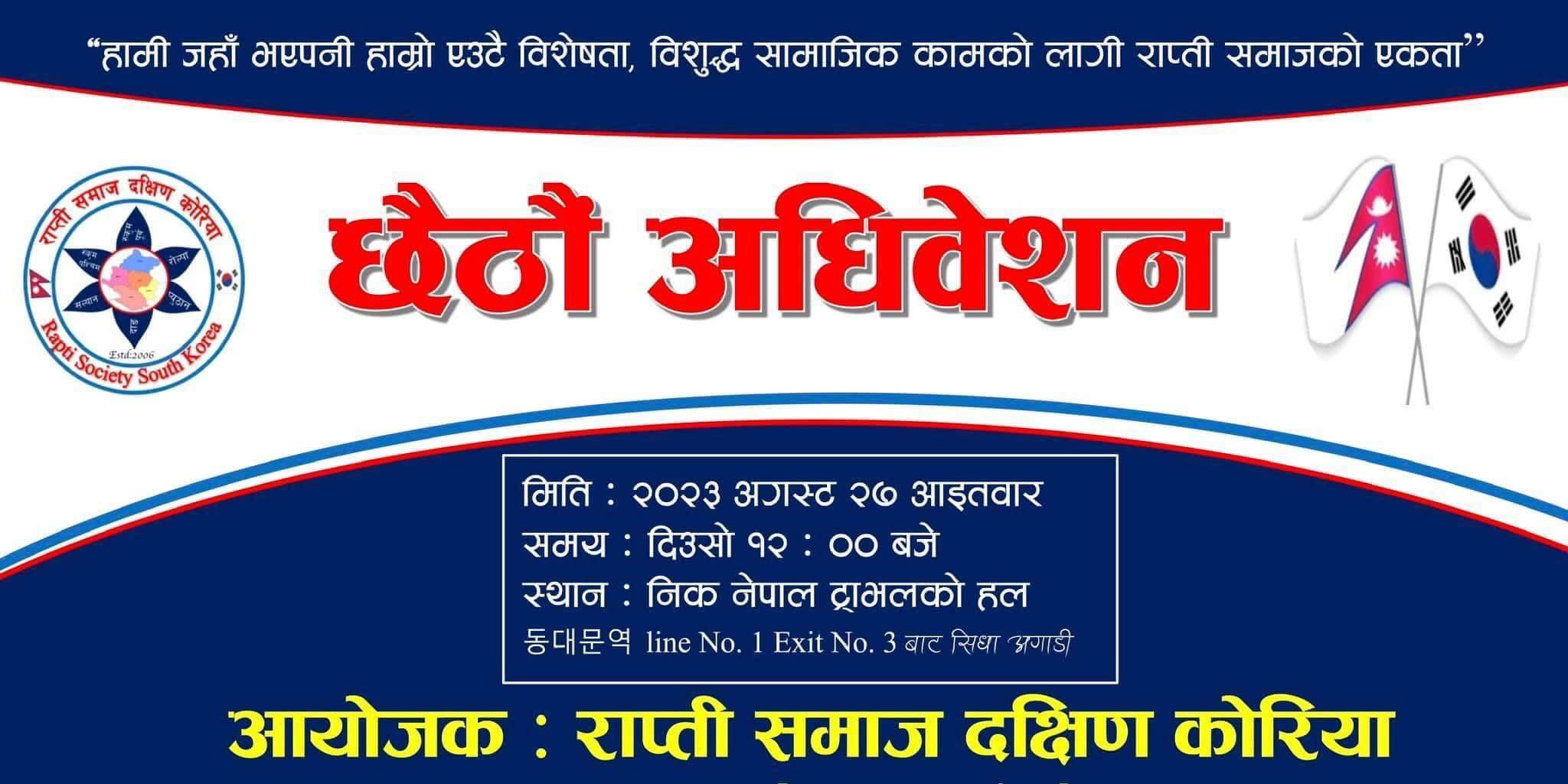 कोरियामा रहँदा भैपरी आउने विभिन्न समस्याहरुको समाधान गर्न तत्पर र कोरियाली भूमिमा नेपालको प्राकृतिक सम्पदा, कला, संस्कृतिको जगेर्ना गर्दै सामाजिक सेवामा योगदान दिईरहेको सन् २००६ मा स्थापित राप्ती समाजले दिनको १२ बजेदेखि शुरु हुने गरी सो अधिवेशनको तयारीमा जुटेको संस्थाका महासचिव अमृत के.सी.ले स्पष्ट पारे ।