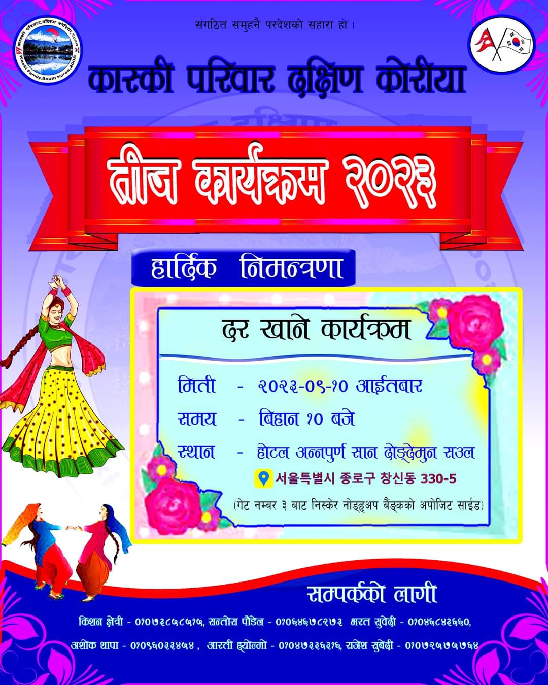 कास्की परिवार दक्षिण कोरियाले आयोजना गरेको तीज कार्यक्रम २०२३ सभ्य र भब्य रुपमा सफल बनाउन कोरियामा रहनुहुने सम्पूर्ण नेपाली दाजुभाई तथा दिदीबहिनीहरुमा आयोजकले गरिमामय उपस्थितिको लागि हार्दिक अनुरोध गरेको छ ।