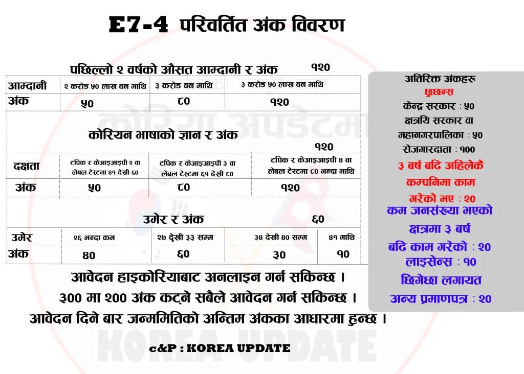 E-7-4 को नयाँ अंक प्रणाली निर्धारण २०० अङ्क भन्दा धेरै पोइन्ट हुनेले अप्लाइ गर्न मिल्ने, कुनकुन मा कति कति पोइन्ट त? नेपालीमा