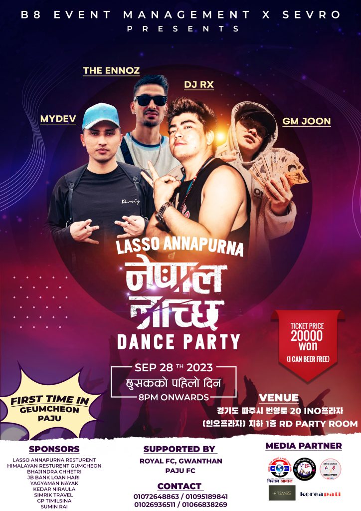 B8 EVENT MANAGEMENT र SEVRO CLOTHING BRAND को आयोजना मा GUMCHEON PAJU मै पहिलो पटक 경기도 파주시 번영로 20 INO 프라자 (인오프라자)지하 1 층 RD PARTY ROOM मा आयोजना हुने LASSO ANNAPURNA नेपाल नाच्छ DANCE PARTY को टिकट शुल्क २०००० वन तोकिएको छ। DJ RX सहित THE ENNOJ,GM JOON,MYDEV लगायतका artist हरुको बेजोड प्रस्तुती रहने नेपाल नाच्छ डान्स पार्टीमा प्रवेश शुल्क २०००० वन तिरेपछि १ क्यान बियर फ्रिमा पाइने छ।