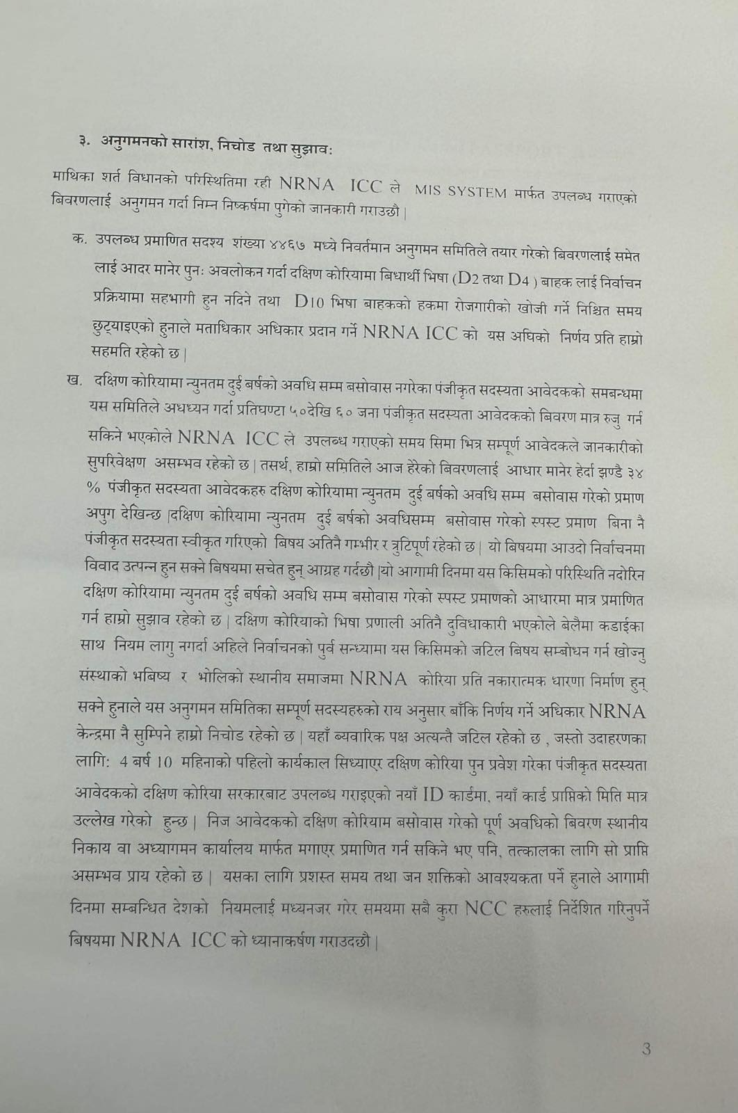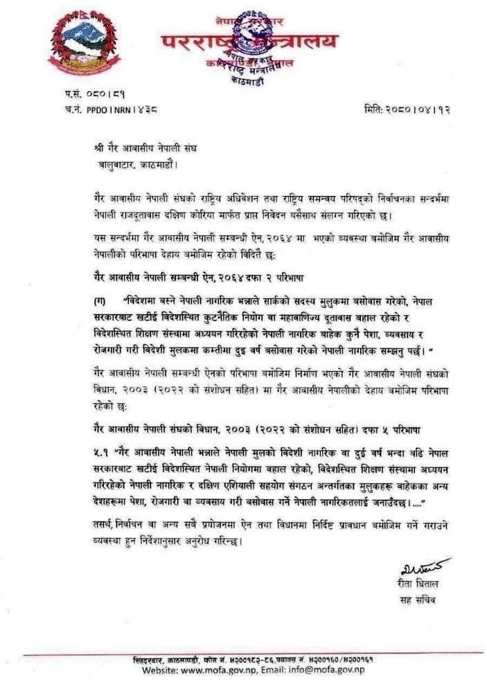 पत्रमा संघको राष्ट्रिय अधिवेशन तथा राष्ट्रिय समन्वय परिषद्को निर्वाचनका सन्दर्भमा नेपाली दूतावास दक्षिण कोरियामार्फत निवेदन प्राप्त भएको उल्लेख थियो ।