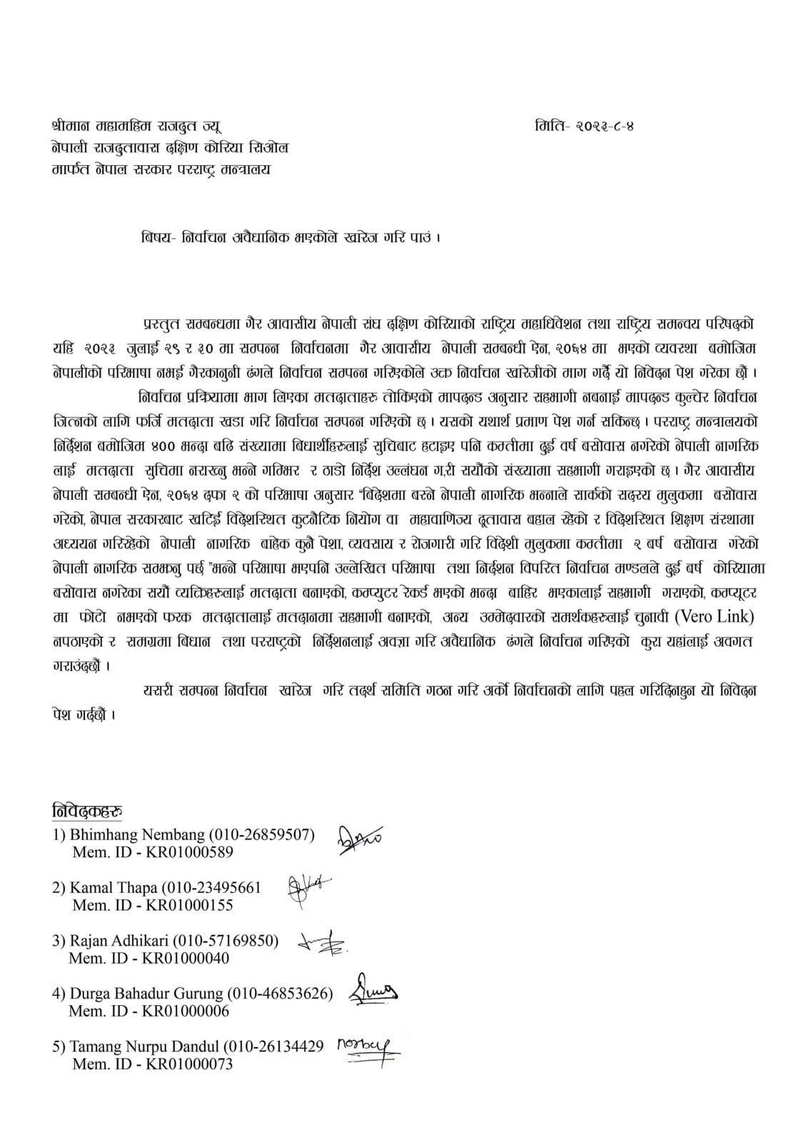 यस्तै नेपाली राजदूतावास दक्षिण कोरियामा निर्वाचन अवैध भएको दाबीसहित जीवन शर्मा, अन्जु गुरुङ, युवराज गौतम, शिव विश्वकर्मा र निश्चल राईले उजुरी दिएका छन् ।