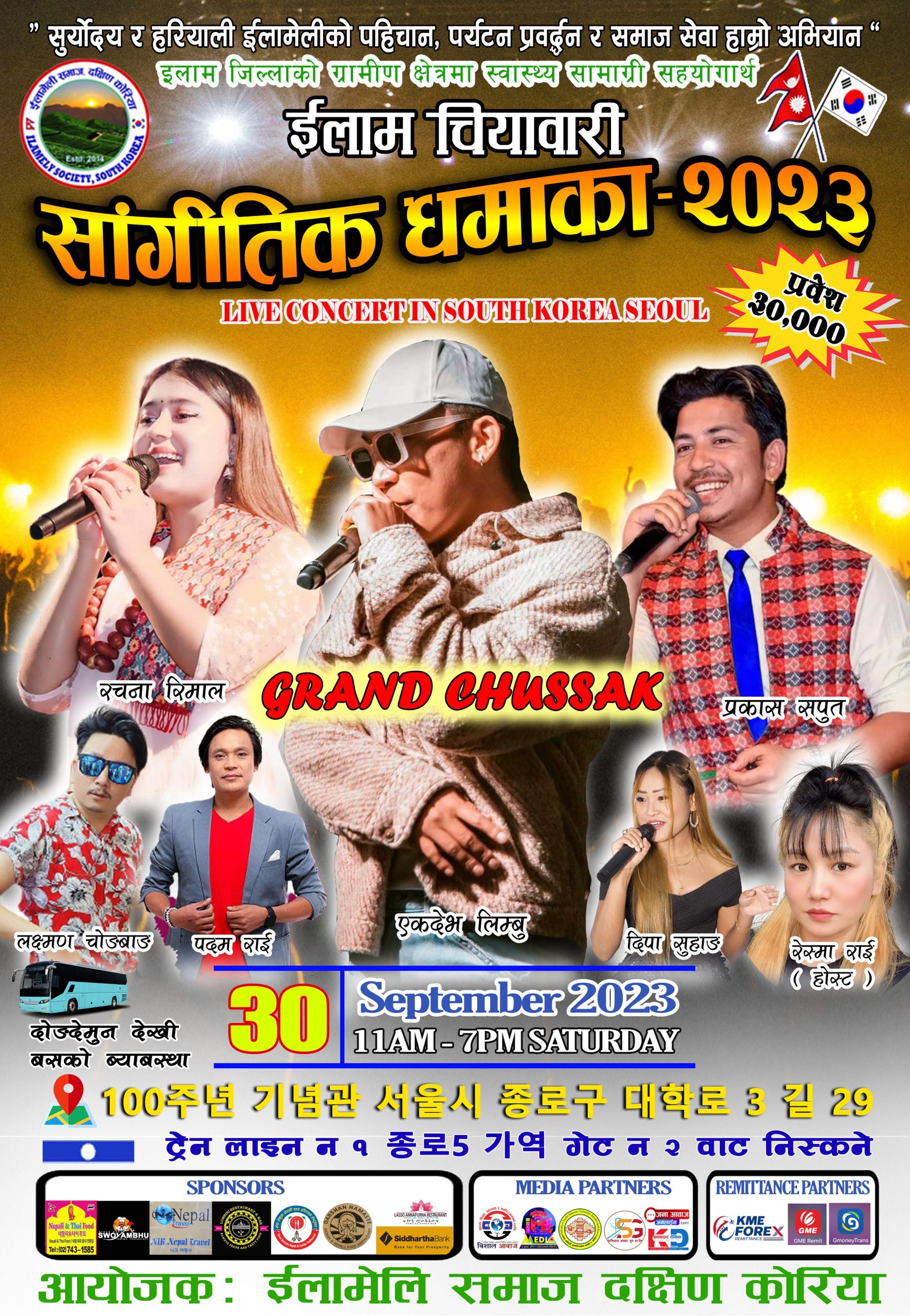 सेप्टेम्बर ३० तारिख ११ बजे वाट साझ ७ बजे सम्म हुने इलाम चियाबारी सांगितिक धमाका २०२३ मा नेपालको चर्चित राष्ट्रिय कलाकार हरु एकदेव लिम्बु,प्रकाश सपुत,रचना रिमाल लगायत पदम राइ,दिपा सुहाङ्ग लक्ष्मन चोङबाङ र साथमा रेश्मा राइले सन्चालन गर्ने कार्यक्रममा स्थानिय कलाकारहरुले बेजोड प्रस्तुती रहने आयोजकले जनाएको छ। 100주년 기념관 서울시 종로구 대학로 3 길 29 ट्रेन लाइन १ 종로5 가역 गेट न २ बाट निस्केर ५ मिनेट हिँडेर पुग्न सक्ने (दोङ्देमुन ३ नम्बर गेटबाट कार्यक्रम स्थान सम्म पुग्न बसको व्यबस्था गरिएको) हलमा आयोजना हुने इलाम चियाबारी सांगितिक धमाका २०२३ को प्रवेश शुल्क ३०००० वन तोकिएको छ। नेपाली सम्पर्क समिति दक्षिण कोरिया द्वारा आयोजित कार्यक्रम वाडफाड कार्यक्रममा छूसकको तेश्रो दिन सेप्टेम्बर ३० तारिक पूर्वाञ्चल सरोकार समाज अन्तर्गत इलामेली समाजले कार्यक्रम गर्ने प्रस्ताव इलामेली समाज दक्षिण कोरियाको अध्यक्ष टिका थेगिम ले लानु भएपश्चात त्यहा वाट पारित भएर कार्यक्रम गर्ने अनुमति पाएको थियो।