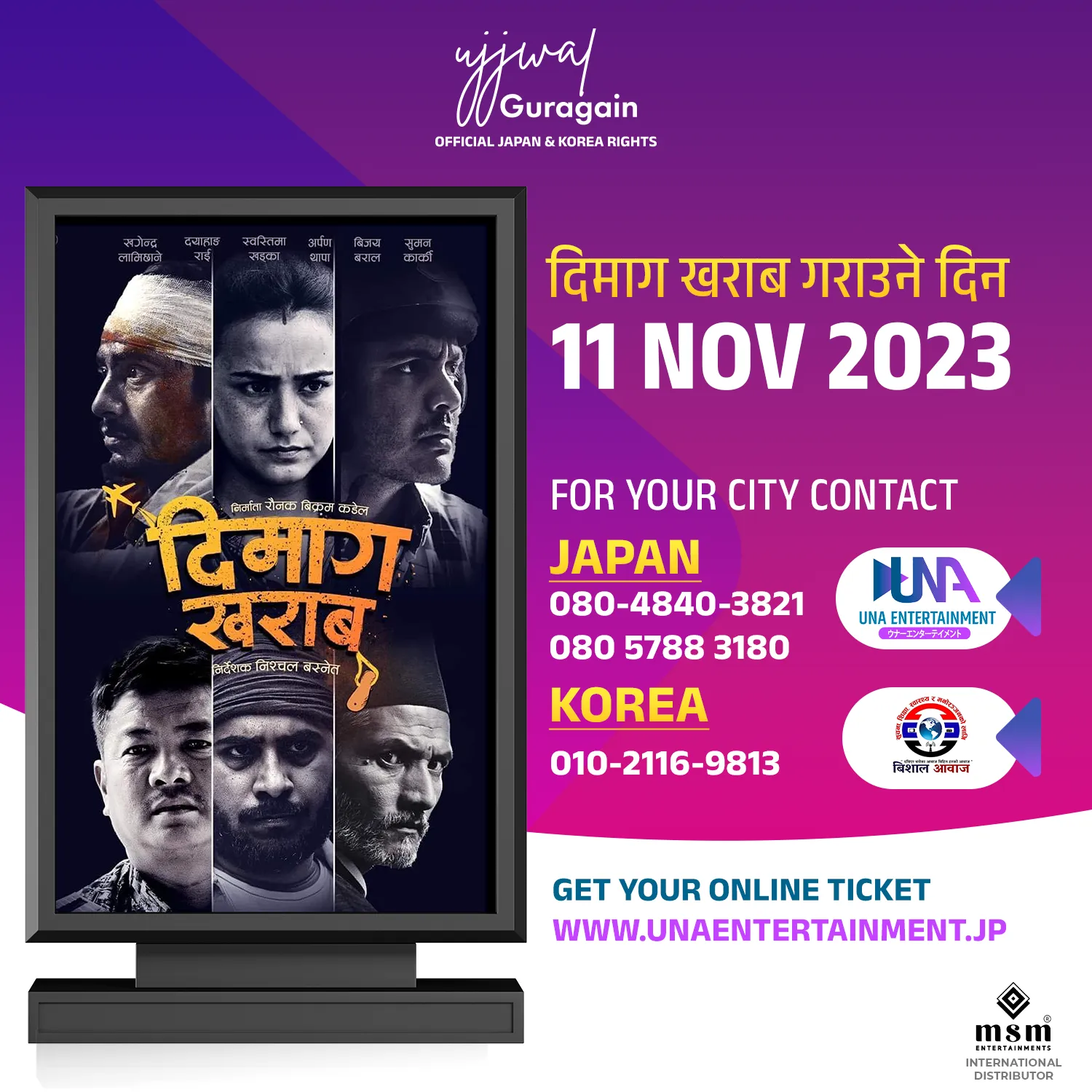 यसैगरी जापान कोरियाको प्रदर्शन अधिकार पाएको युना इन्टरटेन्मेन्टले जापान र कोरिया विशाल आवाजको सहकार्यमा पनि एकैसाथ प्रदर्शन गर्ने भएको छ। युना इन्टरटेन्मेन्टले ले तिजमा नाङ्गो गाउ, दशैंमा भष्मे डन र तिहारमा दिमाग खराब जापानमा चलाउने छ भने विशाल आवाजले एक भगवत् गिता र दिमाग खराब कोरियामा प्रदर्शन गर्ने छ।