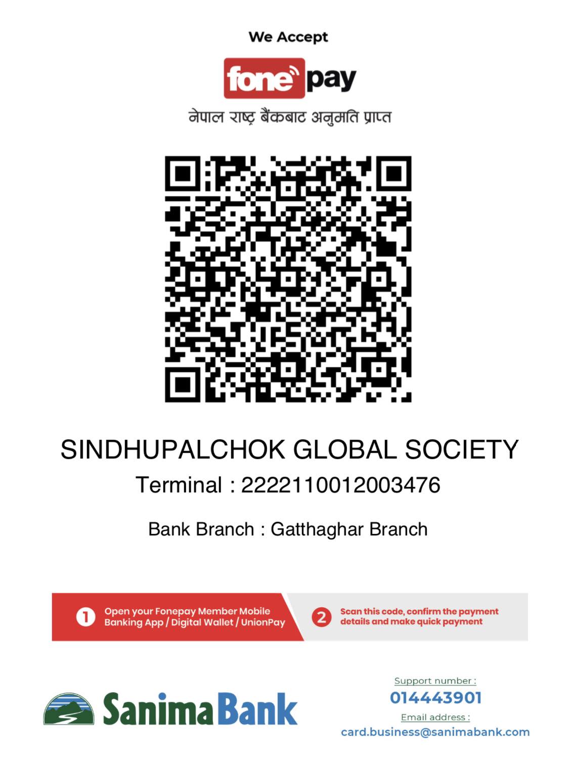Sanima Bank , Gatthaghar Branch , Ac no : 076010010000472, Account Name : SINDHUPALCHOK GLOBAL SOCIETY