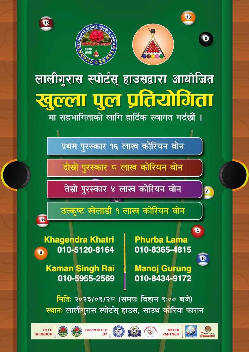 विशाल श्रेष्ठ/दक्षिण कोरिया: लालीगुँरास स्पोर्ट्स हाउस साउथ कोरिया ह्वासङ फारान द्वारा यही आऊदो सेप्टेम्बर २८ तारीकका दिन ह्वासङमा खुल्ला पुल प्रतियोगिता हुने भएको छ।
