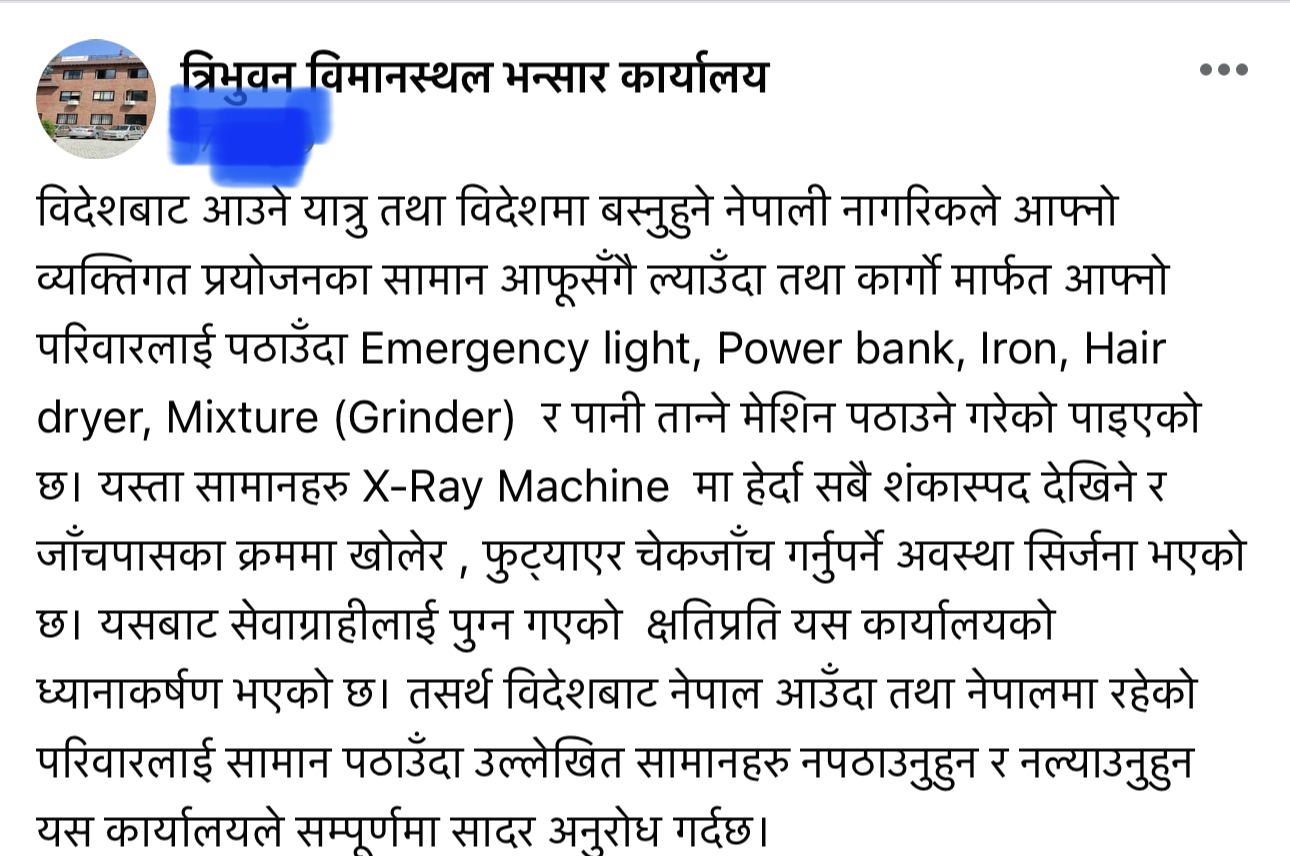 त्रिवि भन्सारको आग्रह : यी सामान एक्सरेमा शंकास्पद देखिन्छ, नल्याउनू-नपठाउनू