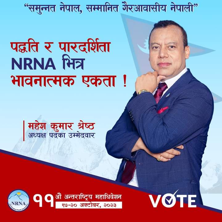 उनी एनआरएनएको नेतृत्व सम्हालेर मुलुकको समृद्धिमा काम गर्न अघि बढेको बताउँछन् । सोहीअनुसार व्यवसायी श्रेष्ठले यस पटक एनआरएनएको अध्यक्षमा उम्मेदवारी दिने घोषणा गरिसकेका छन् । एनआरएनएको ११औं महाधिवेशनमा यही असोज ३० अर्थात अक्टोबर१७ देखि काठमाडौंमा हुँदैछ ।