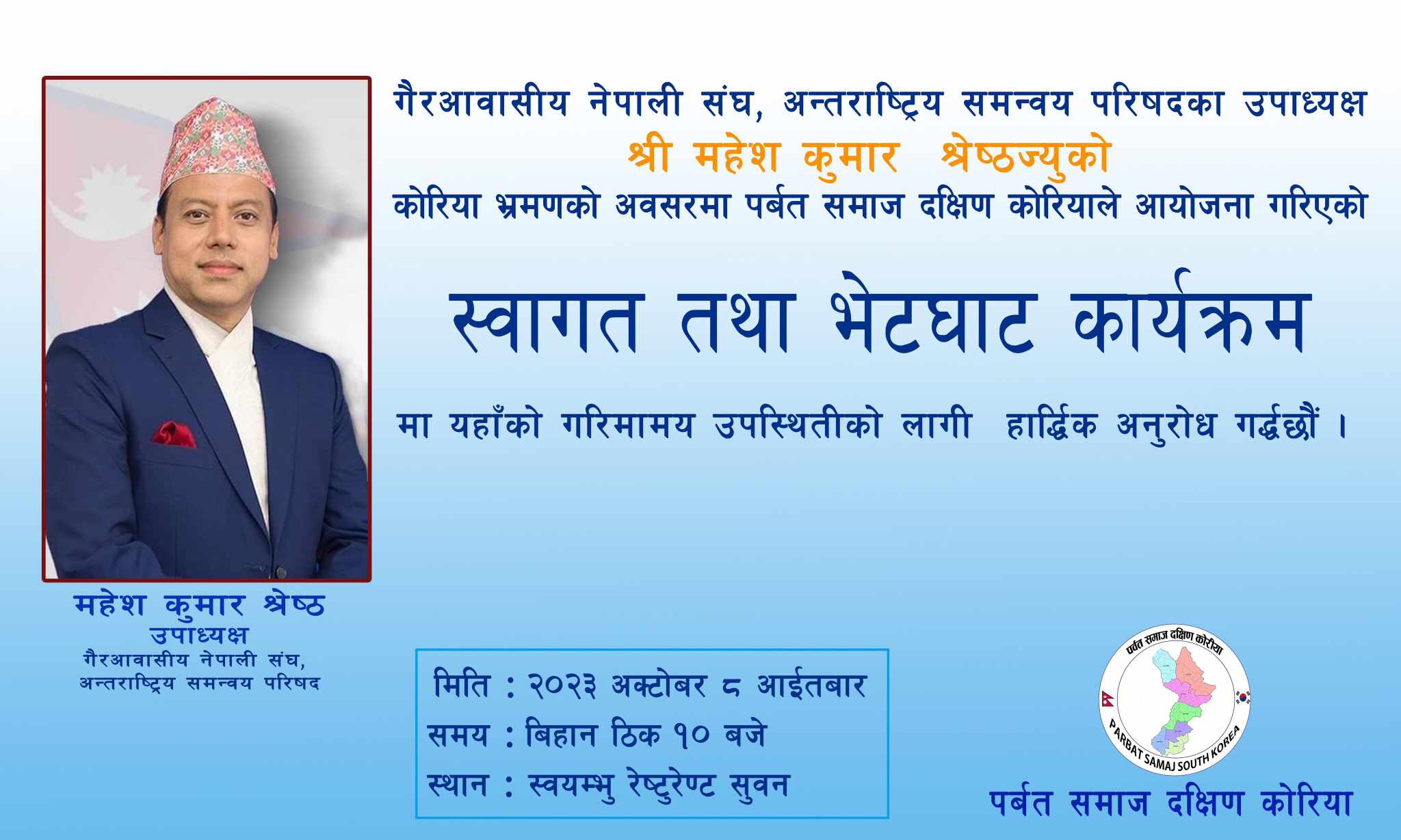 सुवन स्थित स्वंयभु रेस्टुरेन्टमा आयोजना गरिएको कार्यक्रममा पर्वत समाजका अध्यक्ष दिपक केसी र प्रमुख सल्लाहकार नविन पराजुलीले दोसल्ला ओडाएर सम्मान गर्नुभएको थियो । कार्यक्रमलाई सम्बोधन गर्दै अध्यक्ष पदका उम्मेदवार महेश श्रेष्ठले एनआरएनए र क्षेत्रीय संस्था एकाअर्काको परिपुरक रहेकोले यसको संरक्षण गर्दै निरन्तरता दिनुपर्ने बताउनुभयो उहाँले आफु बिजय भएको खण्डमा अहिले देखीएका समस्याहरु हल गर्ने गरि एजेन्डा अगाडी सारेको प्रष्ट पार्नुभएको थियो । आफ्नो जन्मथलो पर्वतसंग कोरियामा जोडीन पाउदा परिवारसंग भेटिएको महशुस भएको भनेर खुशी व्यक्त गर्नुभयो ।