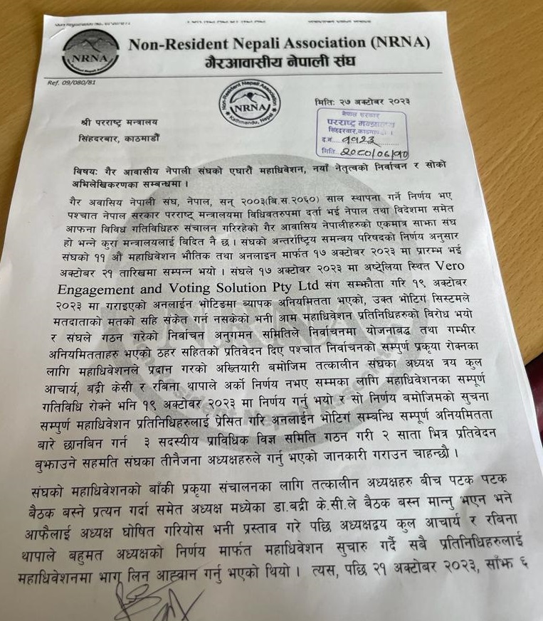 काठमाडौं, १० कात्तिक । गैर आवासीय नेपाली संघ (एनआरएनए) को आधिकारिकताको दाबी गर्दैै आरके शर्माले नेतृत्वको समूहले परराष्ट्र मन्त्रालयमा निवेदन दिएको छ । अनलाइन माध्यमबाट गत अक्टोबर १९ मा भएको निर्वाचनमा धाधली भएको भन्दै बहुसंख्यक समूहले शर्माको नेतृत्वमा नयाँ कार्यसमितिको घोषणा गरेको थियो । सोही समितिले अधिवेशन सम्पन्न गरेको सहितका कागजपत्र पेश गर्दै परराष्ट्र मन्त्रालयमा आफूहरु आधिकारिक रहेको दाबी गरेको हो । उक्त निवेदन परराष्ट्रमा ११२३ नम्बरमा दर्ता गरिएको छ ।
