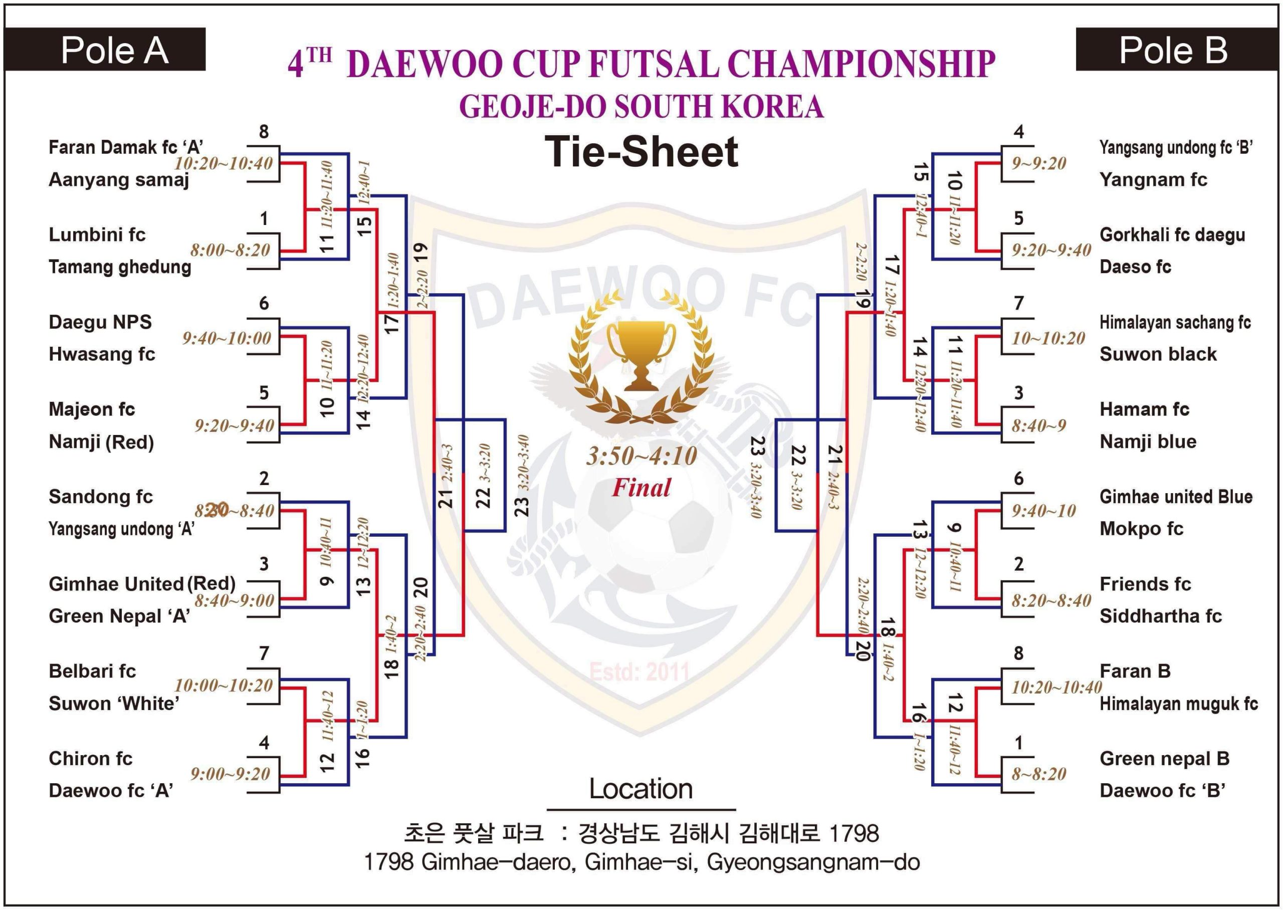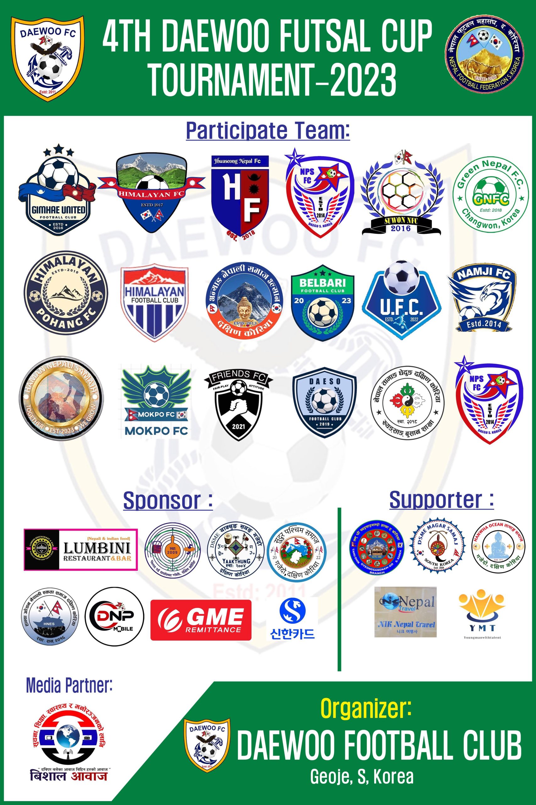 डेउ एफ सी द्वारा आयोजना गरिने उक्त प्रतियोगिता कोरियामा हाल सम्म कै सर्वाधिक धनराशी पुरस्कार भएको फुटसल प्रतियोगिता रहेको संरक्षक नरेश श्रीस मगरले बताउदै दक्षिण कोरियामा रहेका सम्पुर्ण फुटसल क्लब तथा खेलाडी शुभचिन्तक हरुलाई समयमै प्रतियोगितामा सहभागी हुन हार्दिक अपिल समेत गर्नुभएको छ।।