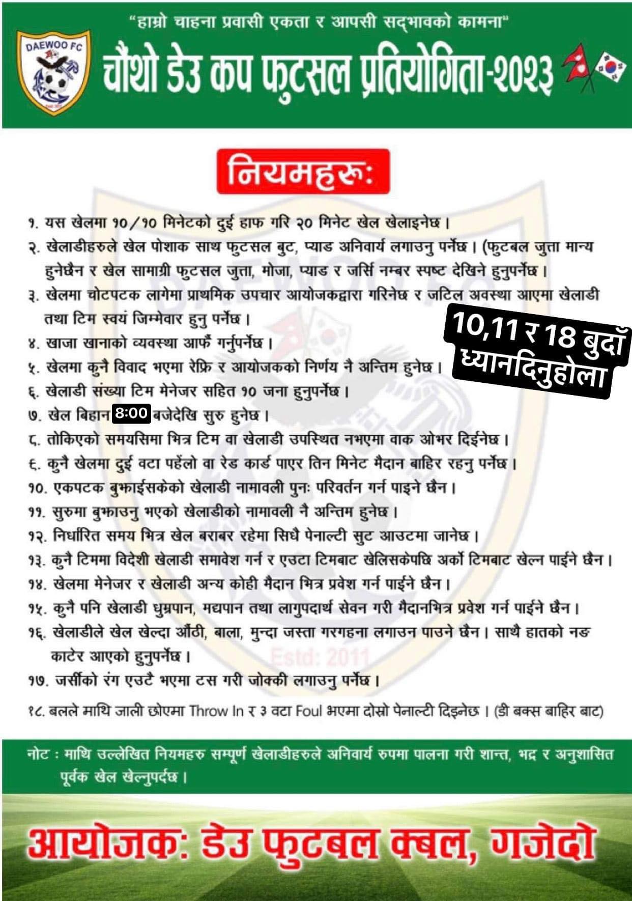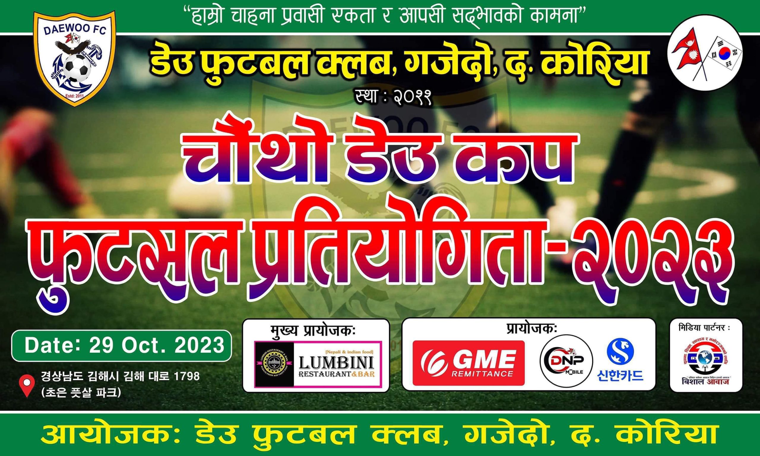 विशाल श्रेष्ठ/दक्षिण कोरिया: “हाम्रो चाहना प्रवासी एकता र आपसी सद्भावको कामना” भन्ने मुल नारा लिएर स्थापित डेउ फुटबल क्लबको आयोजनामा “खेलकुद कोष स्थापनार्थ” यहि अक्टोबर २९ तारिख आइतबार 경상남도 김해시 김해 대로 1798(초은 픗살 파크) मा आयोजना हुन गइरहेको दक्षिण कोरियामै हालसम्मकै ठुलो धनराशिको “चौथो डेउ फुट्सल कप 2023” को अन्तिम तयारी पुरा भएको छ।