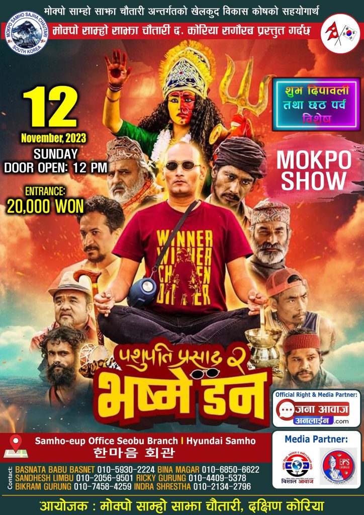 मोक्पो सहरको samho-eup office seobu Branch Hyundai samho (한마음 회관) मा 12 बजे प्रदर्शन हुने फिल्ममा विपिन कार्की, स्वस्तिमा खड्का, सौगात मल्ल, रवीन्द्र सिंह बानियाँ, माओत्से गुरुङ, प्रकाश घिमिरे, लोकेन्द्र लेखक लगायतको अभिनय छ । ‘पशुपति प्रसाद’ को सिक्वेलको रूपमा निर्माण भएको यो फिल्मले पशुपति प्रसादको मृत्युपश्चात् पशुपति क्षेत्रमा आफ्नो अस्तित्व स्थापित गर्न सङ्घर्षरत भस्मे डनको जीवन कथा बोल्छ ।