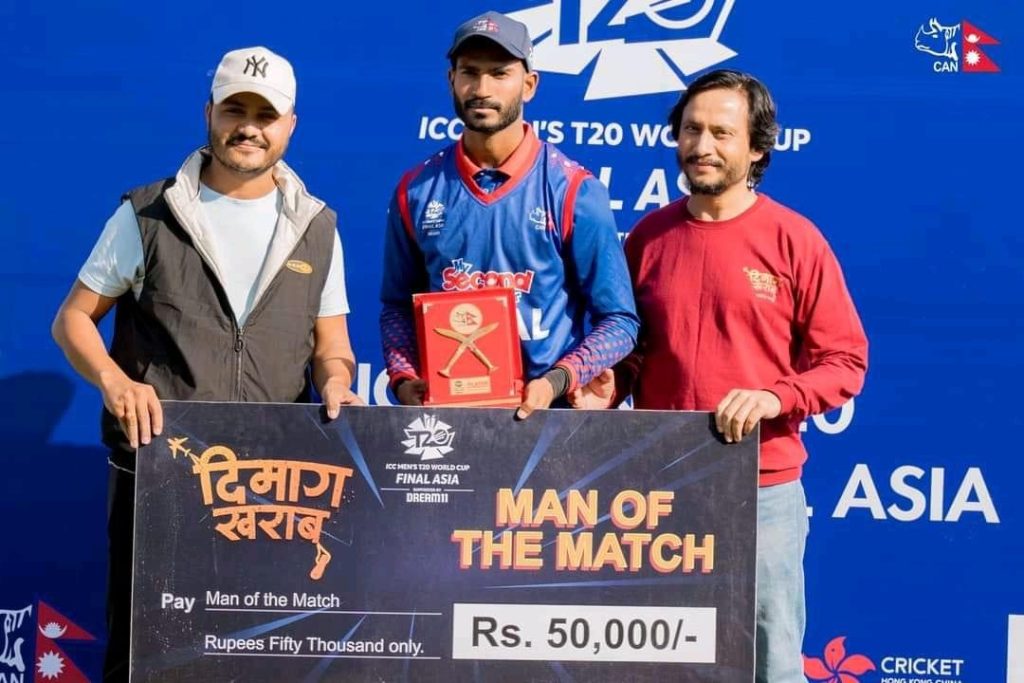 युएईसँगको म्याचमा ‘दिमाग खराब म्यान अफ द म्याच’ र ‘बेस्ट सर्ट्स अफ द डे’का लागि आशिफ शेखलाई नगद पुरस्कार प्रदान गरेको छ । यी दुई शीर्षकमा शेखले क्रमशः ५० तथा १० हजार नगद पुरस्कार प्राप्त गरेका छन् । उनलाई ‘म्यान अफ द म्याच’को पुरस्कार सिनेमाका प्रमुख अभिनेता खगेन्द्र लामिछाने तथा सुमन कार्कीले प्रदान गरे भने अभिनेत्री स्वस्तिमा खड्का बेस्ट सर्ट्स अफ ट डेको पुरस्कार प्रदान गरिन् ।