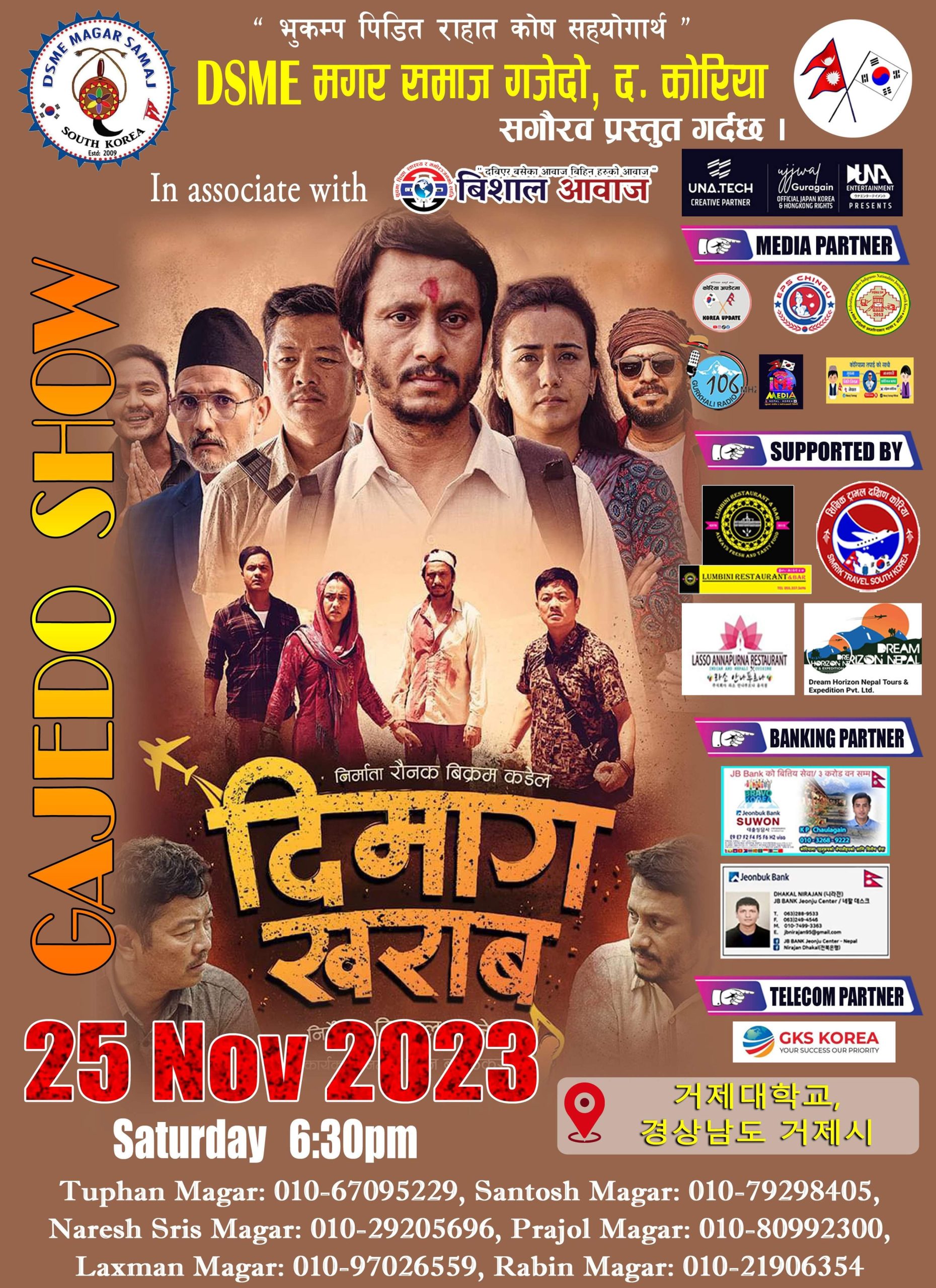 शुक्रबारबाट बिश्वभर र 19 नोभेम्बर बात बाटा कोरियामा रिलिज हुने निश्चल बस्नेत निर्देशित सिनेमा ‘दिमाग खराब’ले आफनो नयाँ गीत रिलिज गरेको छ । बुधबार सिनेमाले ‘हजुरी’ बोलको गीत सार्वजनिक गरेको हो । सार्वजनिक गीत जयन जे वाइवाको शब्द-रचना तथा संगीतमा तयार भएको हो ।
