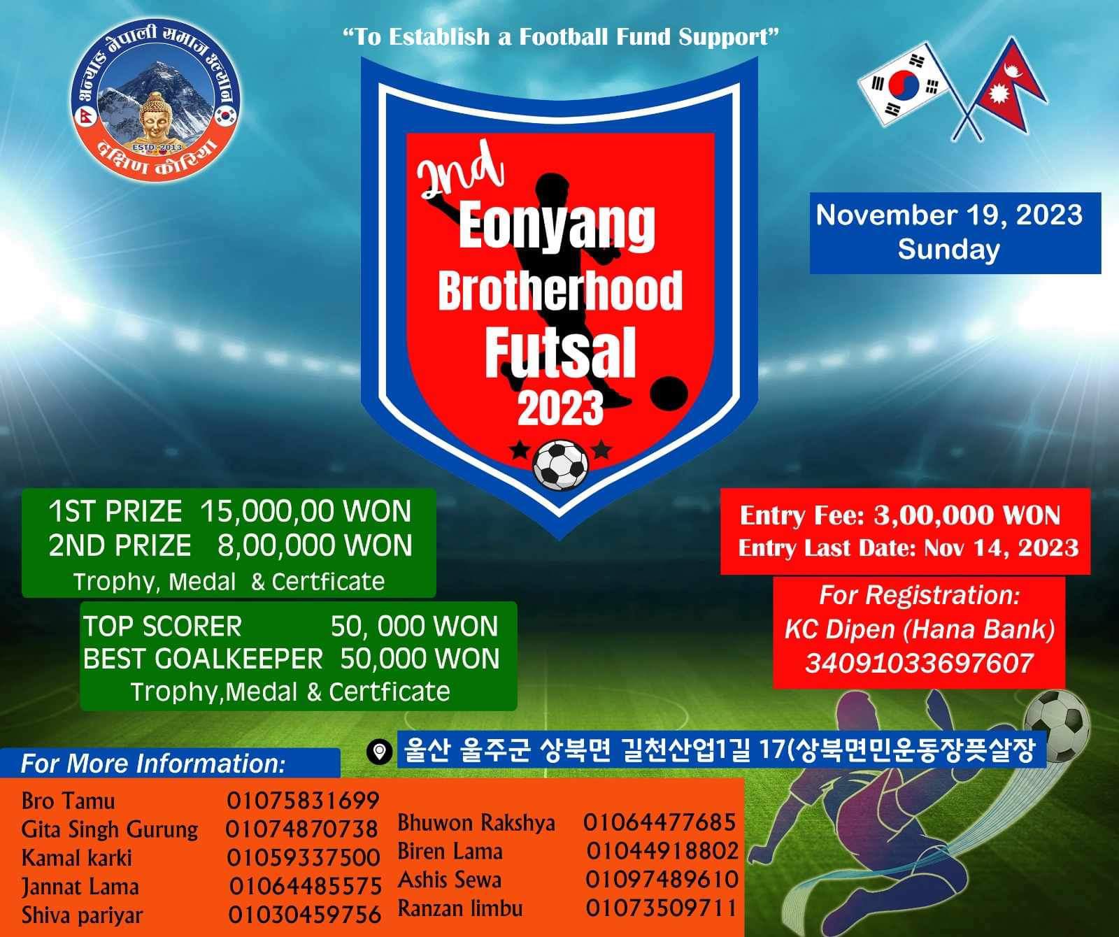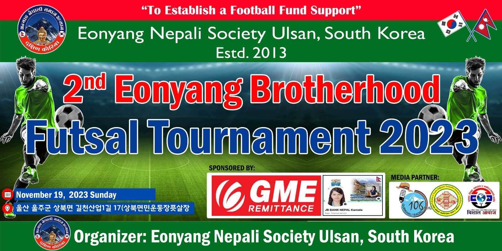 बिशाल आवाज :फुटबल फन्ड सहयोगार्थ गर्ने उद्देश्यका साथ अन्यांड नेपाली समाज उल्सान ले नोभेम्बर १९ तारिक कोरियाको 울산 울주군 상북면 길천산업1길 17(상북면민운동장픗살장 मा “दोश्रो अन्याङ ब्रदरहुड फुटसल टुर्नामेन्ट २०२३” आयोजना गर्ने भएको छ ।