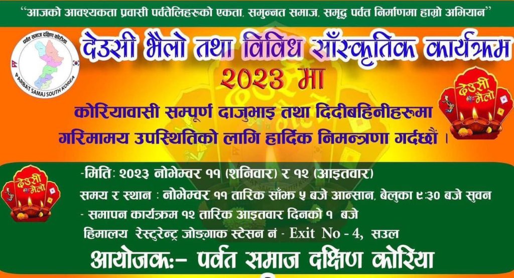 विशाल आवाज:शुभ दिपावली २०८० को पावन अवसरमा पर्वत समाज द कोरियाले नोभेम्बर ११ मा आनसान र सुवनमा तथा १२ तारिख आइतबार दिउसो १ बजे देखि जोङ्गाकको हिमालयन रेष्टुरेन्टमा देउसी भैलो तथा विविध सास्कृतिक साझ-२०२३ को समापन कार्यक्रम आयोजना गर्ने भएको छ।