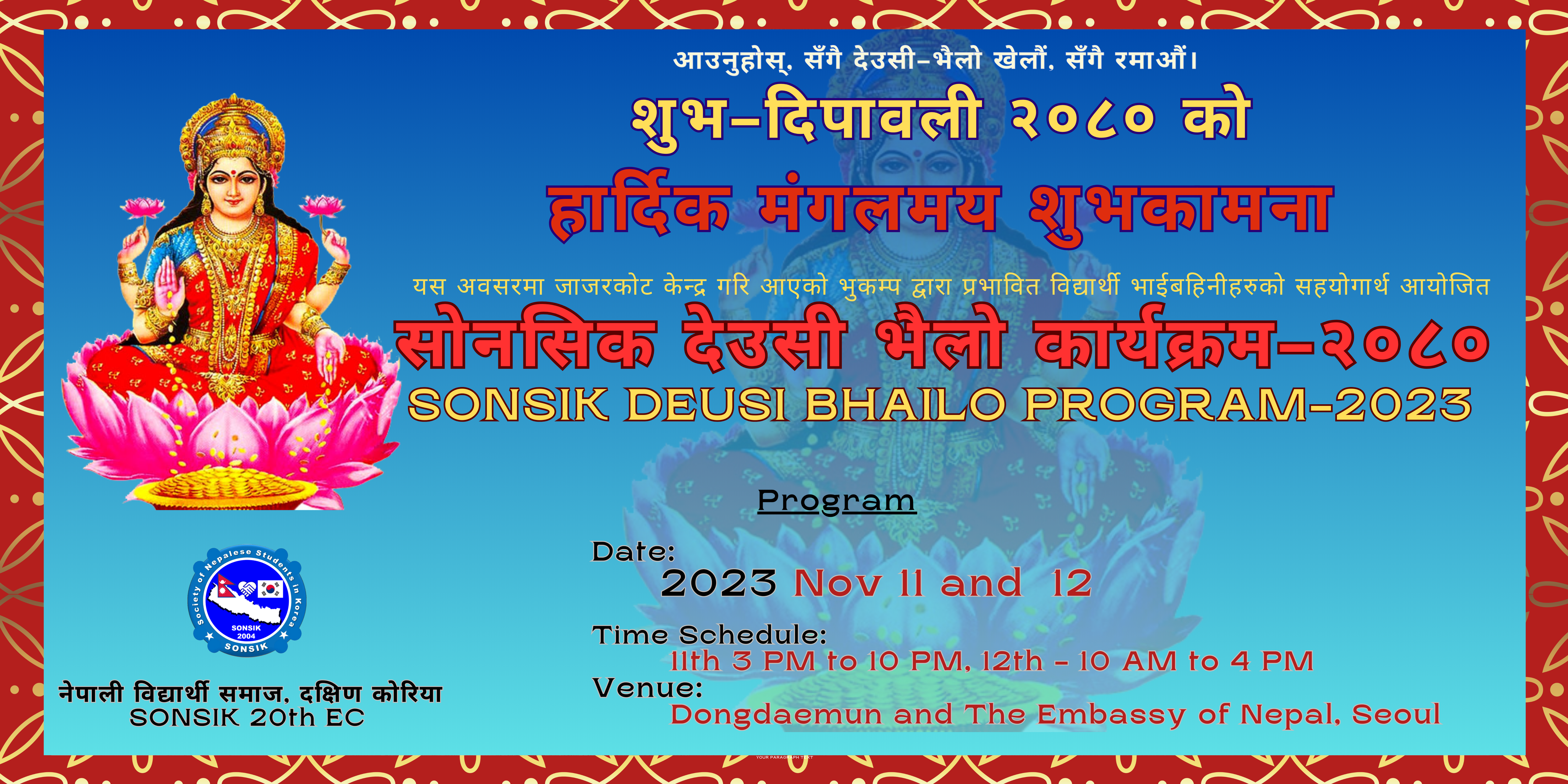 जाजरकोट केन्द्र गरि आएको भुकम्प द्वारा प्रभावित बिधार्थि हरुको सहयोगार्थ आयोजित नोभेम्बर ११ तारिख दिउसो ३ देखि १० बजे सम्म र १२ तारिख बिहान १० बजे देखि दिउसो ४ बजे सम्म हुने देउसी भैलो कार्यक्रम दोङ्देमुन आसपासका क्षेत्रहरूमा र नेपाली राजदुतावास सउलमा संचालन हुने सोनसिकले जानकारी गराएको छ । हरेक बर्ष तिहारको अवसर पारेर देउसी भैलो कार्यक्रमहरु गर्दै आइरहेको सोनसिकले यसपाली पनि कार्यक्रम गर्न लागेको हो ।