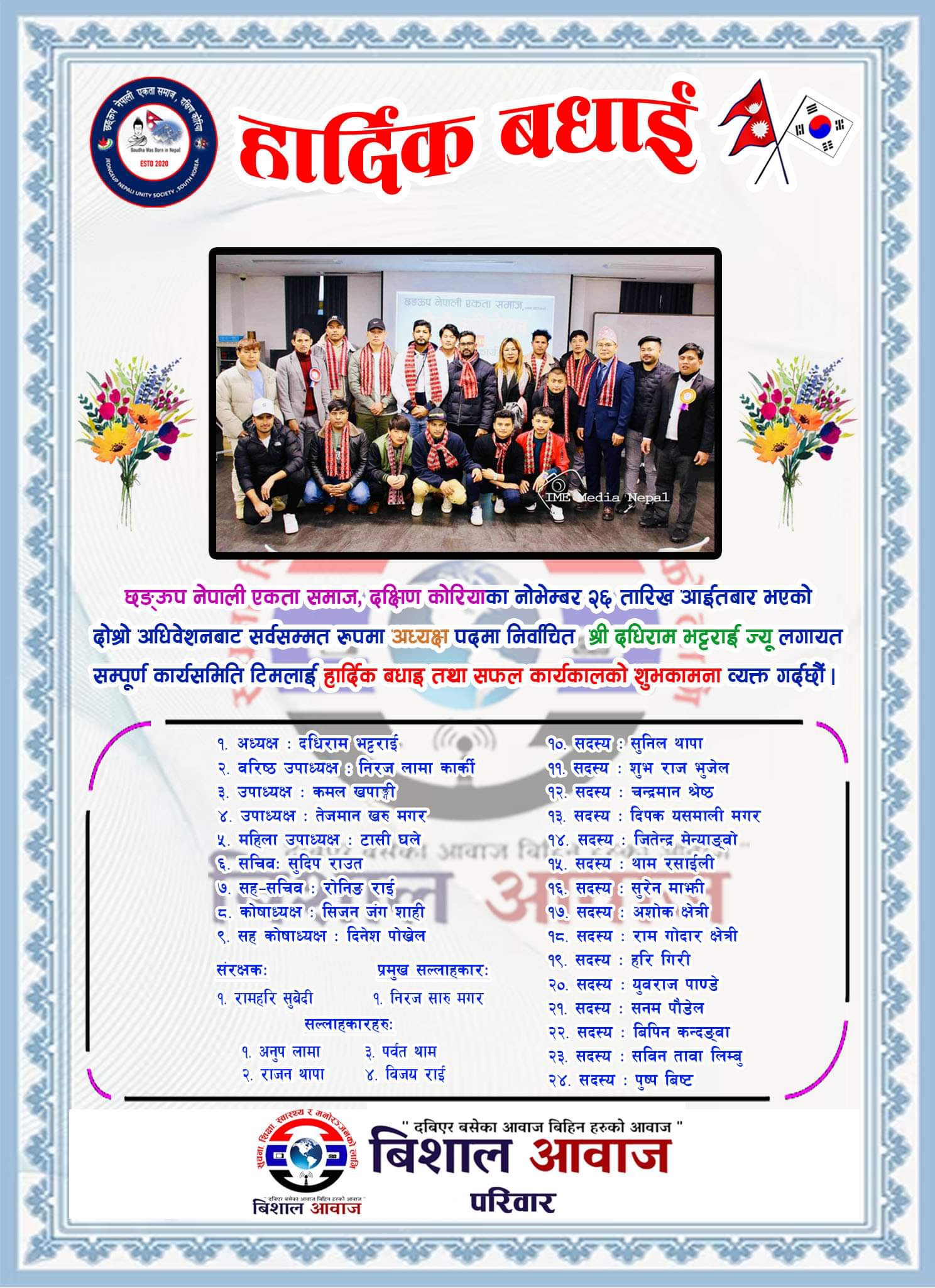राम थापा मगरको संयोजकत्वमा बनेको निर्वाचन कमिटिमा सम्पन्न बन्द सत्र कार्यक्रम वाट दधिराम भट्टराईको अध्यक्षतामा २४ सदस्य कार्यसमिति चयन गरिएको छ।नया कार्यसमितिको ब. उपाध्यक्षमा निरज लामा कार्की,उपाध्यक्षहरुमा कमल खपाङ्गी,तेजमान खरु मगर,महिला उपाध्यक्षमा टासी घले,सचिवमा सुदिप राउत,सह-सचिवमा रोनिङ राई,कोषाध्यक्षमा सिजन जंग शाही,सह- कोषाध्यक्षमा दिनेश पोख्रेल र सदस्यहरु मा सुनिल थापा,शुभ राज भुजेल,चन्द्रमान श्रेष्ठ,दिपक यसमाली मगर,जितेन्द्र मेन्याङ्वो,थाम रसाईली,सुरेन माझी,अशोक क्षेत्री,राम गोदार क्षेत्री,हरि गिरी,युवराज पाण्डे,सनम पौडेल,बिपिन कन्दङ्वा,सविन तावा लिम्बु ,पुष्प बिष्ट सर्वसम्मत चयन भएको छ। यसैगरी समाजको संरक्षकमा रामहरि सुबेदी ,प्रमुख सल्लाहकारमा निरज सारु मगर ,सल्लाहकारहरुमा अनुप लामा,राजन थापा,पर्वत थाम,विजय राई चयन गरिएको छ।
