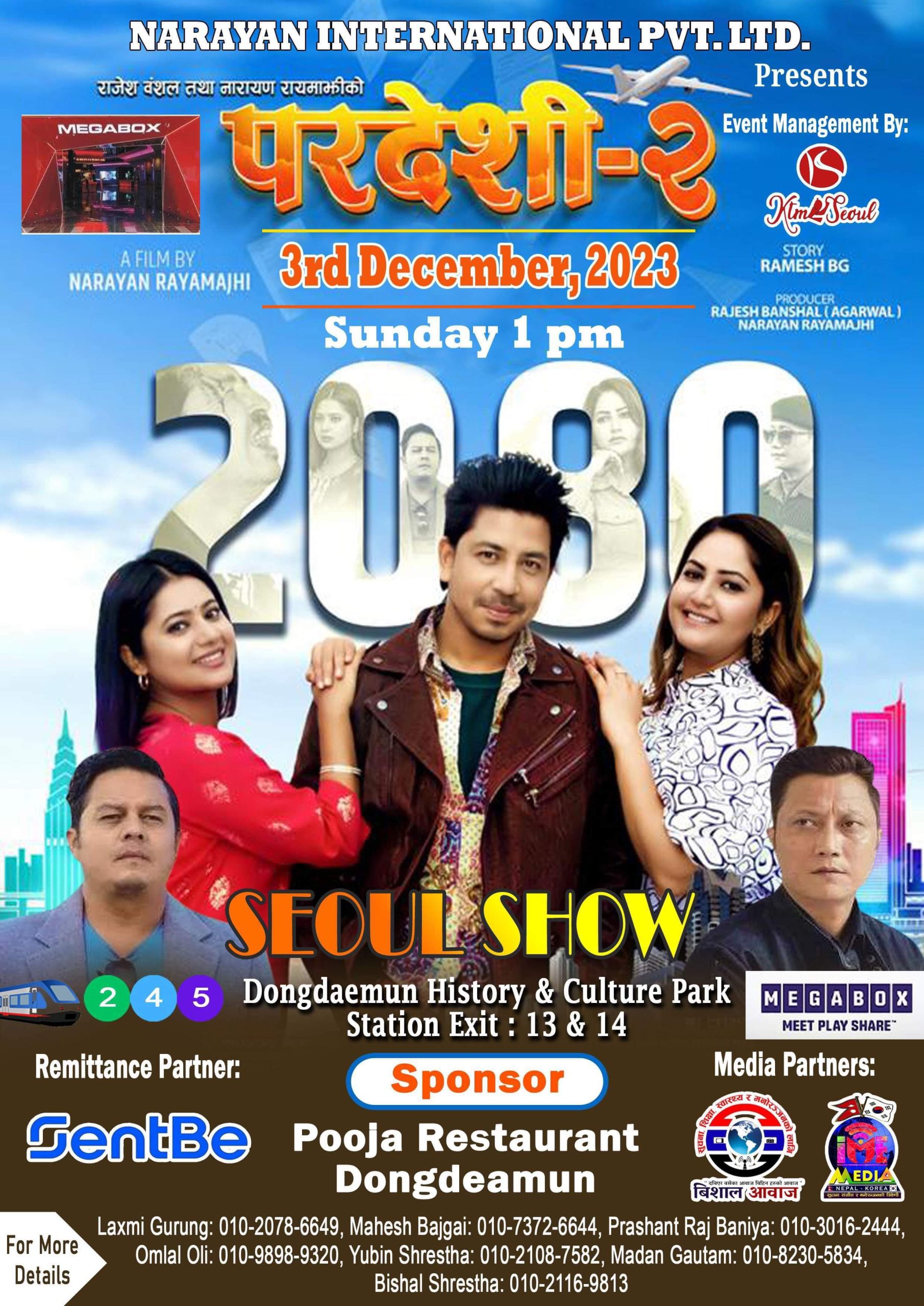 बिशाल आवाज :नारायण रायमाझी निर्देशित नेपाली चलचित्र ‘परदेशी-२’ कोरियाको राजाधानी सऊलको दोङ्देमुन हिस्टोरिकल पार्क छेउमा रहेको मेगाबक्समा यही आउदो डिसेम्बर ३ तारिकका दिन आइतबार १ बजे प्रदर्शन हुने तय भएको छ ।