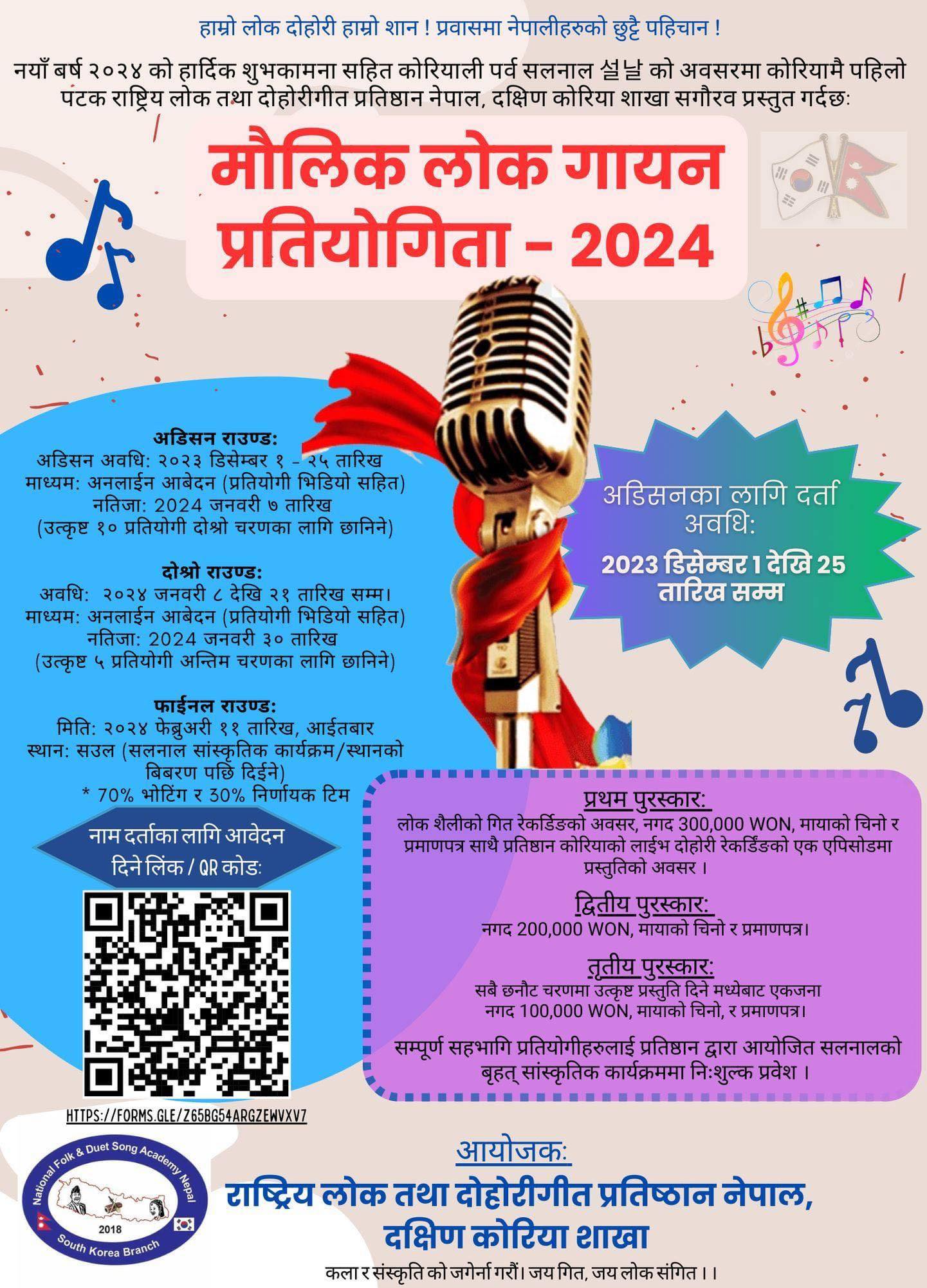 * प्रस्तुतिमा , देश को राष्ट्रियता , समाज, ब्यक्ति अथवा कसैको आत्म सम्मान मा ठेस लाग्ने खालको शब्द वा शैलि प्रस्तुत गर्न पाईने छैन ! राष्ट्रिय लोक तथा दोहोरीगीत प्रतिष्ठान नेपाल, दक्षिण कोरिया शाखाको आयोजनामा कोरियामै पहिलो पटक मौलिक लोक गायन प्रतियोगिता २०२४ आयोजना हुन लागेको हुनाले दक्षिण कोरिया बासि सम्पुर्ण लोकगित प्रेमि हरुमा प्रतियोगितामा सहभागी भएर कार्यक्रममा रौनकता बढाइदिन हुन आयोजकले हार्दिक अनुरोध गरेको छ।
