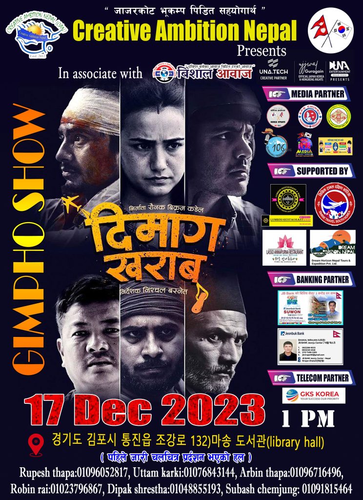 विशाल आवाज: विश्व भर सफलतापूर्वक प्रदर्शन भैरहेको निश्चल बस्नेत निर्देशित सिनेमा ‘दिमाग खराब’ “जाजरकोट, रुकुम, सल्यान भूकम्प पीडित सहयोग तथा विपत राहत कोष स्थापनार्थ” creative ambition Nepal (CAN) ले डिसेम्बर १७ तारिख आइतबार 경기도 김포시 통진읍 조강로 132(마송 도서관) मा दिउसो १ बजे किम्फो मा प्रदर्शन गर्ने भएको छ।