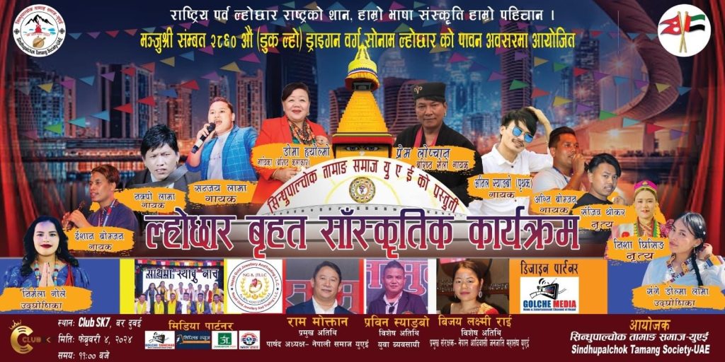 राष्ट्रिय पर्व राष्ट्रको शान , हाम्रो भाषा संस्कृति हाम्रो पहिचान भन्ने मुल नाराका साथ आफ्नो धर्म,संस्कृति,कला,भेष-भुषा,भाषा, परम्परालाई संरक्षण गर्नका निमित्त सिन्धुपाल्चोक तामाङ समाज युएईको अयोजनामा हुन गईरहेको ल्होछार बृहत सांस्कृतिक कार्यक्रममा नेपाली समाज युएई का पार्षद अध्यक्ष समेत रहनुभएका राम मोक्तान प्रमुख अतिथि को रुपमा र विशेष अतिथिको रुपमा युवा व्यवसायी प्रविन स्याङ्बो र नेपाल आदिवासी जनजाति महासङ्घ युएई का प्रमुख संरक्षक बिजय लक्ष्मी राई उपस्थित रहने कार्यक्रम संम्योजक सन्जय लामा गोलेले विशाल आवाज लाइ जानकारी दिनु भएको छ।
