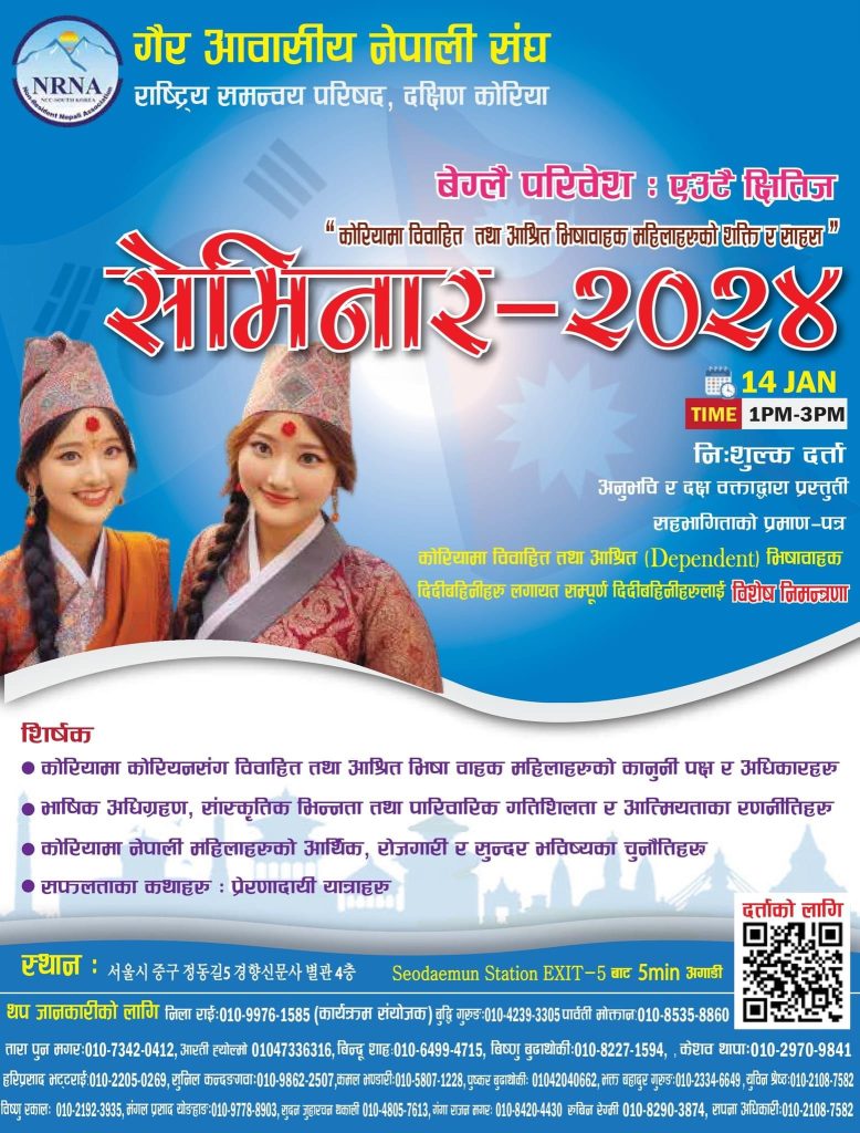 गैर आवासीय नेपाली संघ, राष्ट्रिय समन्वय परिषद, दक्षिण कोरियाले कोरियमा कोरियनसंग बिवाह गरेर आउनु भएका महिला तथा आश्रित (Dependent) भिषामा रहनु भएका महिला दिदीबहिनीहरुलाई लक्षित गरि “कोरियामा विवाहित तथा आश्रित भिषावाहक महिलाहरुको शक्ति र साहस ” बिषयक सेमिनार -२०२४ जनवरी १४ ,सउलमा गर्ने भएको छ।