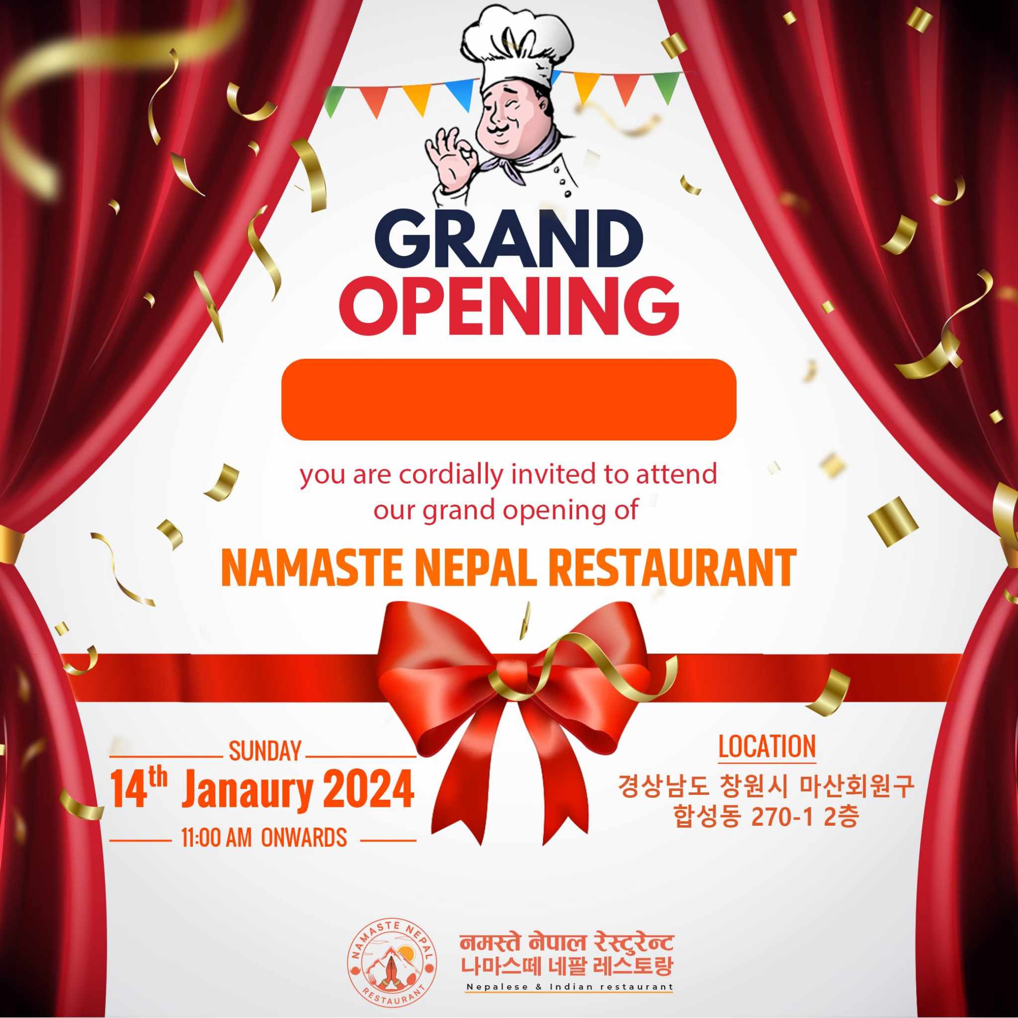 कोरियाको ख्यङ्साङ्नाम्दोस्थित मासान शहरमा पनि पहिलो नयाँ नेपाली रेष्टुरेन्ट संचालनमा आउने भएको छ ! मासान तथा छाङ्वन वरपर रहेका नेपाली खानाका पारखीहरुको मागलाइ मध्यनजर गर्दै मासानमा नमस्ते नेपाल रेष्टुरेन्टको आरम्भ हुने भएको हो ।