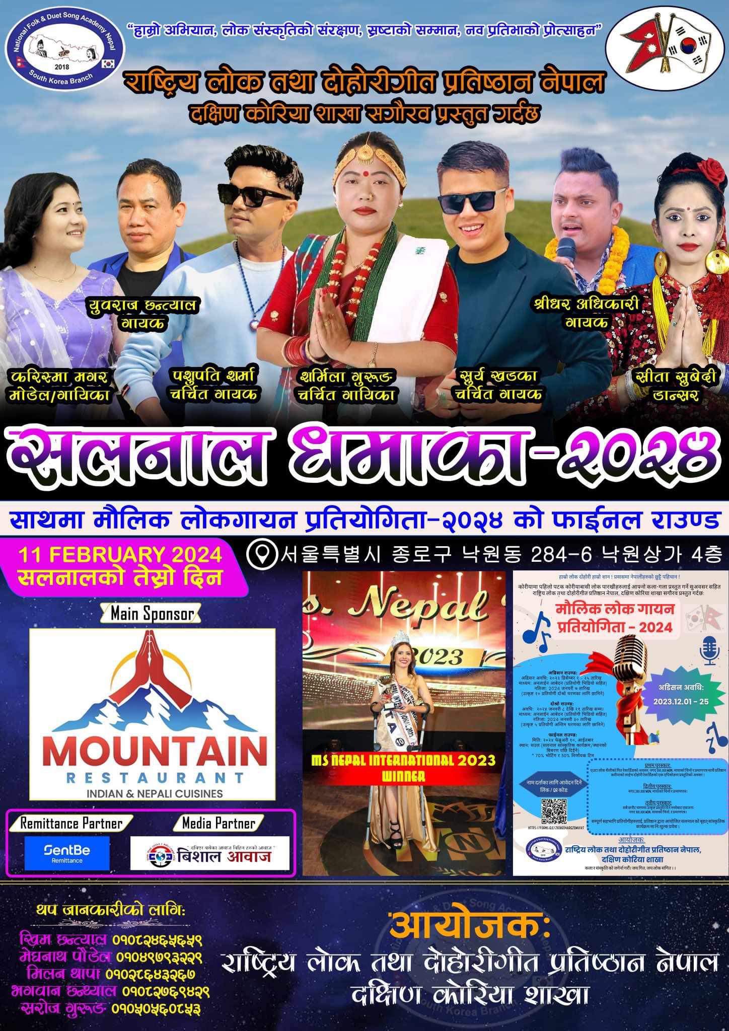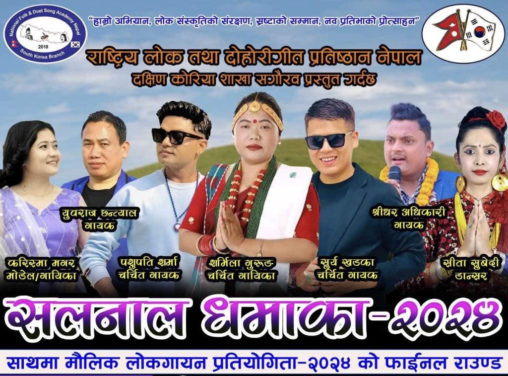 “हाम्रो अभियान,लोक संस्कृतिको संरक्षण,स्रष्टाको सम्मान नवप्रतिभाको प्रोत्साहन” भन्ने मूल नाराका साथ स्थापित राष्ट्रिय लोक तथा दोहोरी गीत प्रतिष्ठान नेपाल दक्षिण कोरिया शाखा द्वारा फेब्रुअरी ११ तारिख आइतबार सलनालको तेश्रो दिन सउलमा रहेको 서울특별시 낙원동 284-6 낙원상가 4 충 मा “सलनाल धमाका-२०२४” साथमा कोरियामै पहिलोपटक “मौलिक लोक गित गायन प्रतियोगिता २०२४” को फाइनल राउण्ड हुने भएको हो। नेपालको राष्ट्रिय चर्चित ख्याति प्राप्त गायिका शर्मिला गुरुङ, लोकदोहोरी मा एकछत्र राज गर्न सफल चर्चित गायक पशुपति शर्मा, युवराज छन्त्याल,सूर्य खड्का,श्रीधर अधिकारीको साथमा Mrs.नेपाल इन्टरनेसनल २०२३ बिजेता तथा डान्सर सीता सुवेदी र मोडेल तथा गायीका करिस्मा मगरको प्रस्तुति रहने आयोजकले जनाएको छ।