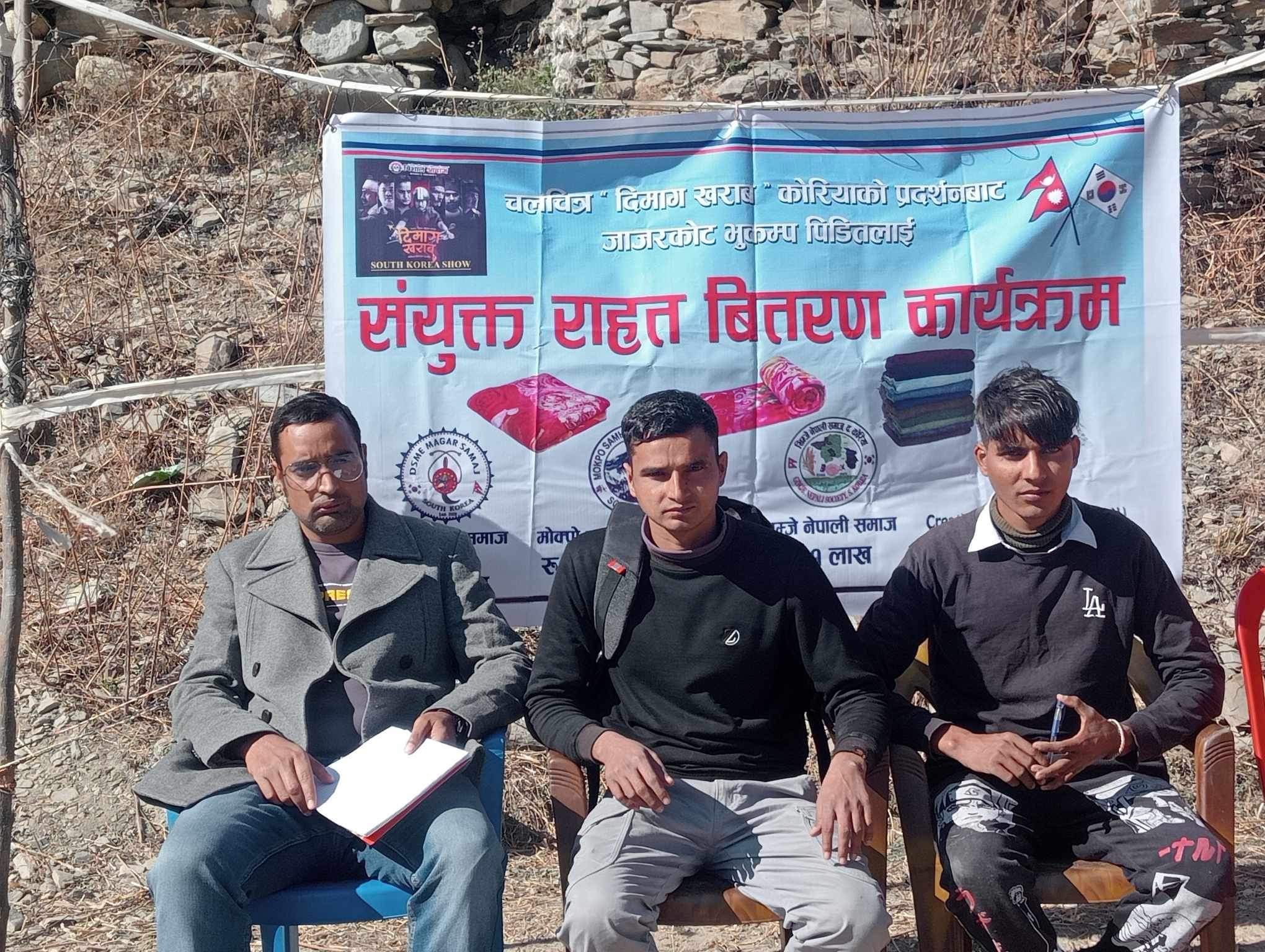 निश्चल बस्नेत निर्देशित सिनेमा ‘दिमाग खराब’ कोरियाको विभिन्न चार सहरहरुमा आयोजक हरुले भुकम्प पिडित सहयोगार्थ प्रदर्शन गरिएको थियो।DSME मगर समाज ले गजेदो सो बाट रु.दुइ लाख,मोक्पो साम्हो साझा चौतारी ले मोक्पो सो बाट रु.एक लाख सत्तरी हजार,खिम्जे नेपाली समाजले खिम्जे सो बाट रु.१ लाख र यसैगरि creative ambition Nepal (CAN) ले खिम्पो सो वाट रु. सत्तरी हजार गरि रु.पाच लाख चालिस हजार एकमुष्ट जम्मा गरि सो रकमको कात्तिक १७ गते जाजरकोटको रामिडाडा केन्द्रविन्दु बनाएर गएको विनासकारी भूकम्प बाट प्रभावित बारेकोट गाउँपालिका वार्ड नं ९ का करिब ३०५ घर परिवार लाइ १/१ थान बाक्लो कम्बल राहत स्वरुप बितरण गरिएको थियो। बारेकोट गाउँपालिका वडा नम्बर ९ का कार्यवाहक अध्यक्ष दिलिप कुमार महत्राको अध्यक्षतामा तथा मोक्पो साम्हो साझा चौतारीका संस्थापक महासचिव विष्णु ज्ञवालीको प्रमुख आतिथ्यता र स्थानीय समाजसेवी द्दय हरि उपाध्याय र समीर चौलागाईंको संयोजनमा राहत वितरण कार्यक्रममा स्थानीय विद्यालयका शिक्षक कर्मचारी लगायत बौद्धिक राजनैतिक र सामाजिक व्यक्तित्वहरूको बाक्लो उपस्थिति रहेको थियो। भूकम्प पीडितहरूले यो कट्याङ्ग्रिदो जाडोमा सरकारबाट खासै सहयोग नपाएता पनि दक्षिण कोरियामा रहेर पनि चलचित्र प्रदर्शनबाट पुण्यको काम गरेकोमा आयोजक तथा नेपाली चलचित्रप्रेमी दर्शक सम्पूर्णमा हार्दिक नमन समेत व्यक्त गरेका थिए।