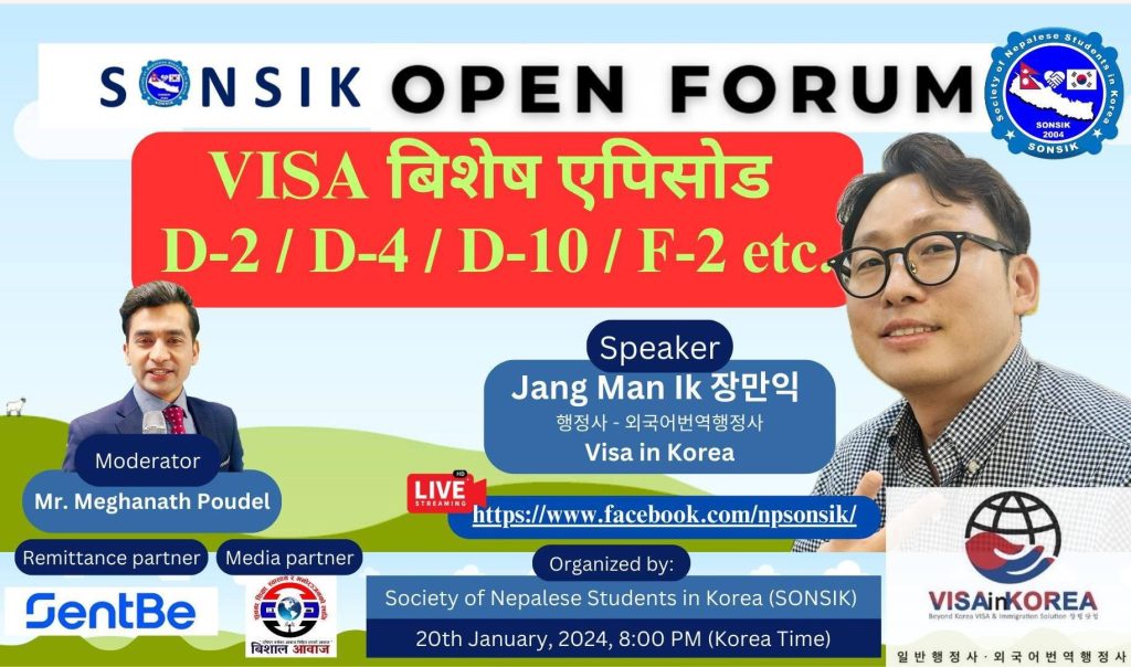 рджрдХреНрд╖рд┐рдг рдХреЛрд░рд┐рдпрд╛рдорд╛ рд░рд╣реЗрдХрд╛ рд╡рд┐рджреНрдпрд╛рд░реНрдереАрд╣рд░реВ Graduation рдкрдЫрд┐ рдЕрд░реБ рдХреБрди-рдХреБрди рднрд┐рд╕рд╛рдорд╛ рдХрд╕рд░реА рдЬрд╛рди рд╕рдХреНрдЫрдиреН? D-2 / D-4 / D-10 / F-2 рдЖрджрд┐ visa рдХрд╛ рдмрд╛рд░реЗрдорд╛ рдХреЗрд╣реА рдмреБрдЭреНрди рдорди рд▓рд╛рдЧреЗрдХреЛ рдЫ? рд╡рд╛ рднрд┐рд╖рд╛ рд╕рдореНрдмрдиреНрдзрд┐ рдХреЗрд╣реА рдЬрд┐рдЬреНрдЮрд╛рд╕рд╛ рдЫ? рдпрджрд┐ рдЫ рднрдиреЗ рдЕрд╡рдХреЛ SONSIK OPEN FORUM рдХреЛ VISA рдмрд┐рд╢реЗрд╖ рдПрдкрд┐рд╕реЛрдб рд╣реЗрд░реНрди рдирдЫреБрдЯрд╛рдЙрдиреБ рд╣реБрди рдЖрдпреЛрдЬрдХрд▓реЗ рдЕрдиреБрд░реЛрдз рд╕рдореЗрдд рдЧрд░реЗрдХреЛ рдЫред