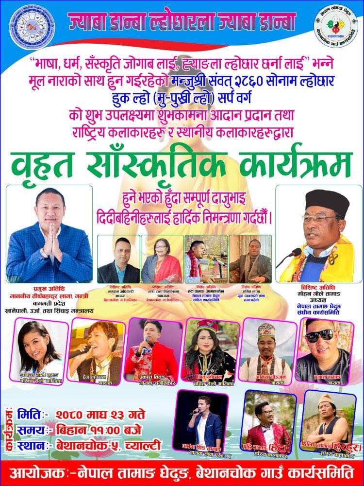 “भाषा धर्म संस्कृति जोगाब लाइ, ह्याङ्ला ल्होछार छर्ना लाइ” भन्ने मूल नाराको साथ मन्जुश्री संवत २८६० सोनाम ल्होछार डुक ल्हो(मु-पुख्री) सर्प वर्ग को शुभ उपलक्ष्यमा शुभकामना आदानप्रदान तथा राष्ट्रिय कलाकारहरू र स्थानीय कलाकारहरूद्वारा बृहत सांस्कृतिक कार्यक्रम हुन लागिएको हो। बागमती प्रदेशको खानेपानी,उर्जा तथा सिँचाई मन्त्री माननीय तीर्थ बहादुर लामा प्रमुख अतिथिको रुपमा उपस्थित हुने कार्यक्रममा नेपाल तामाङ घेदुङ संघीय कार्यसमितिका अध्यक्ष मोहन गोले तामाङ लगायतका विशिष्ट अतिथि आउने आयोजकले जनाएको छ।