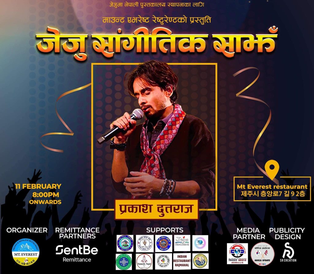 विशाल आवाज: कोरियन नयाँ वर्ष सलनालको अवसरमा फेब्रुअरी ११ तारिख “जेजुमा नेपाली पुस्तकालय स्थापनार्थ” माउण्ट एभरेष्ट रेष्टुरेन्ट जेजुको को आयोजनामा गायक प्रकाश दुतराजको साथमा “जेजु साङ्गितिक साझ २०२४” हुने भएको छ।