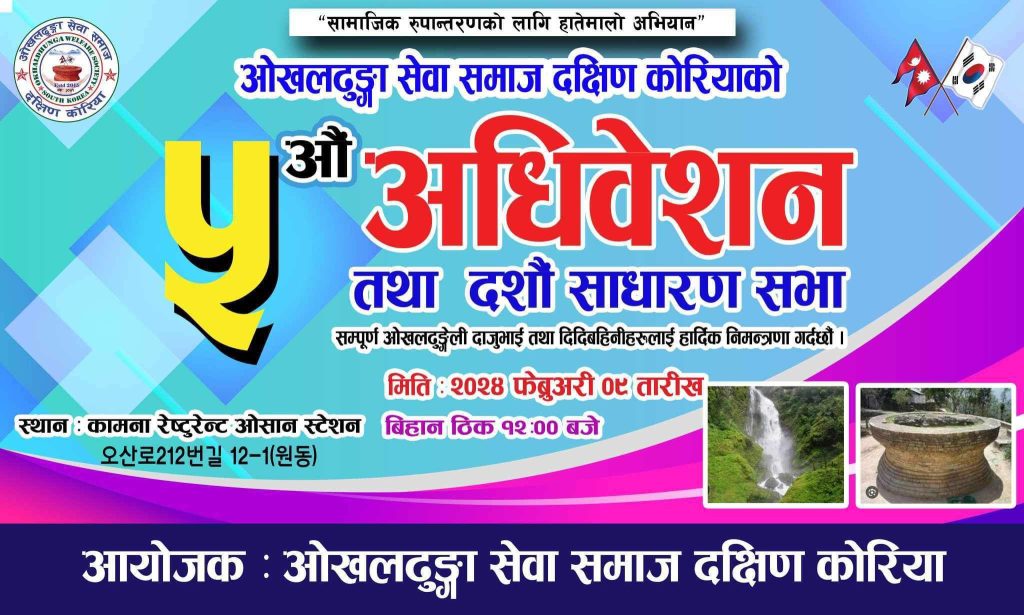 विशाल श्रेष्ठ/दक्षिण कोरिया: ओखलढुंगा सेवा समाज दक्षिण कोरियाको पाचौ अधिवेशन तथा दशौ साधारण सभा फेब्रुअरी ९ तारिखका दिन दिउसो १२ बजे कामना रेष्टुरेन्ट ओसानमा हुने भएको छ।