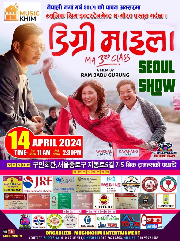 नेपाली नयाँ बर्ष २०८१ को अवसर पारेर म्युजिक खिम ईन्टरटेन्मेन्टको आयोजनामा दोङदेमुनको निक ट्राभल पछाडि रहेको 서울 종로구 지봉로5길 7-5 हलमा पहिलो सो बिहान ११ बजे देखि र दोस्रो सो दिउसो २ः३० वाट गरिने भएको छ।कोरियामा भने नमस्ते फ्यफुल्ला नेपाल कोरियन इन्टरटेन्मेन्ट प्रा लि ले प्रदर्शनको अधिकार प्राप्त गरे संगै २०८१ सालको नयाँ बर्षपछी कोरियाको बिभिन्न सहरहरुमा प्रर्दशन हुदैछ्। दक्षिण कोरियामा रहनुभएका सम्पूर्ण नेपाली भाषी महानुभावहरूमा ‘डिग्री माइला’ चलचित्र हेरेर मनोरञ्जन लिनको लागि चलचित्र प्रदर्शनी कार्यक्रममा उपस्थिति भइदिनुहुनका लागि आयोजकले हार्दिक अनुरोध गरेको छ।