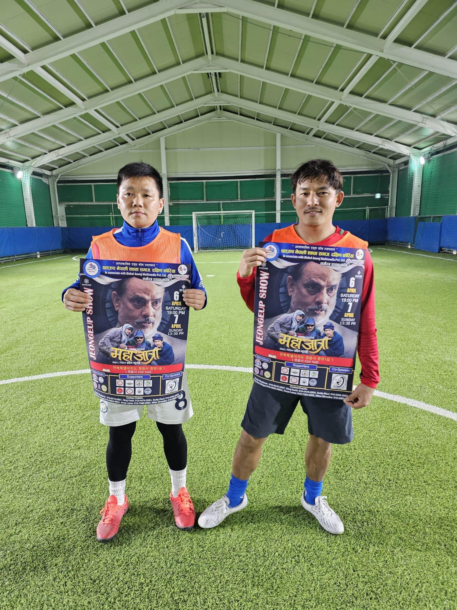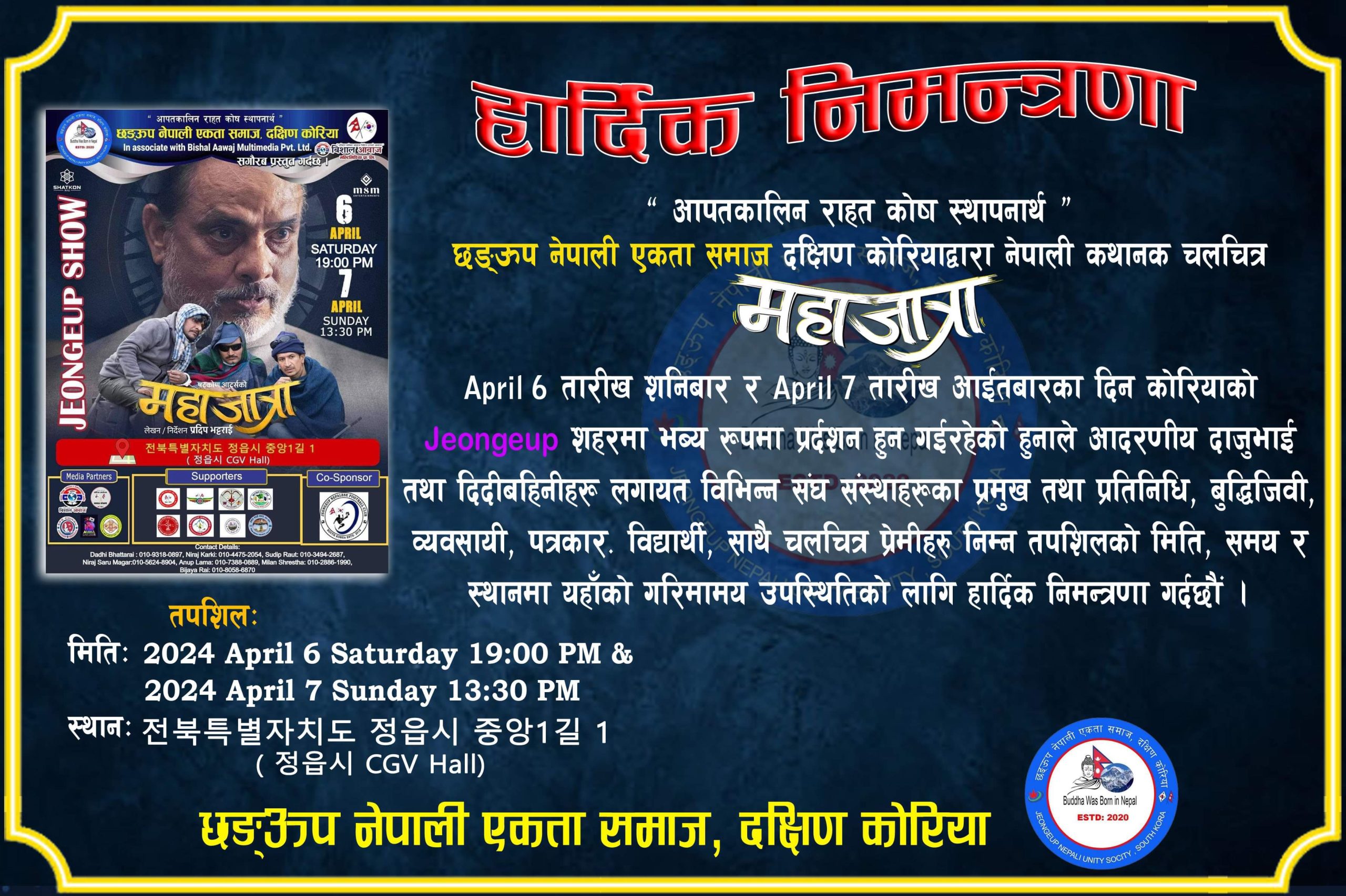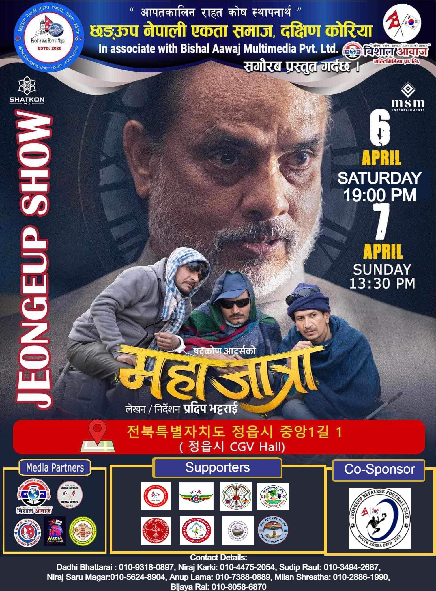 “आपतकालिन राहत कोष स्थापनार्थ” अप्रिल ६ तारिख शनिवार साझ ६ः३० मा र ७ तारिख दिउसो १ः३० मा 정읍시 को 𝐂𝐆𝐕 𝐇𝐀𝐋𝐋 ( 정읍시 중앙 1 길 1 ) मा प्रदर्शन हुने भएको हो विशाल आवाज मल्टिमिडिया प्राली ले दक्षिण कोरियाको प्रदर्शन अधिकार पाएको जात्रा, जात्रै जात्राको अपार सफलतापछिको “महाजात्रा” चलचित्र छङऊप सोको अग्रिम टिकट बुकिङको लागि खाता नँ.Woori Bank 1002855484627 RAUT SUDIP /NH Bank 3020869126601 Anup Lama मा २५००० वन जम्मा गरेर बुकिङ गर्न सकिने आयोजकले बताएको छ। दक्षिण कोरियामा रहनुभएका सम्पूर्ण नेपाली भाषी महानुभावहरूमा “महाजात्रा” चलचित्र हेरेर मनोरञ्जन लिनको लागि चलचित्र प्रदर्शनी कार्यक्रममा उपस्थिति भइदिनुहुनका लागि आयोजकले हार्दिक अनुरोध गरेको छ।हो।थप जानकारीको लागि सम्पर्क व्यक्तिहरु Sudip Raut : 010-3494-2687 Anup Lama : 010-7388-0889