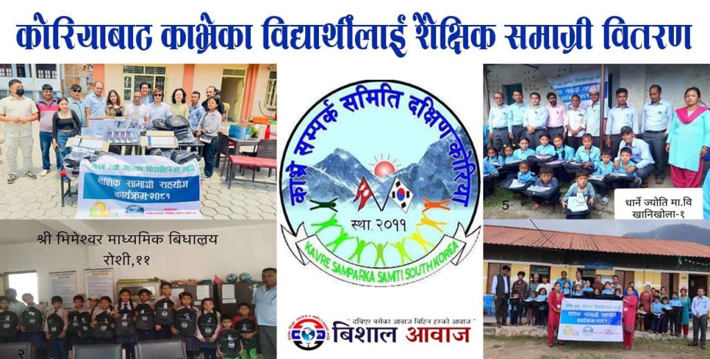 विमल सिं लामा :दक्षिण कोरियामा रहेका काभ्रे जिल्लाबासीहरुका साझा संस्था काभ्रे सम्पर्क समिती दक्षिण कोरियाले आफ्नो जिल्लाका विद्यार्थीहरुलाई शैक्षिक सामग्री वितरण गरेको छ । यस बर्ष जिल्लाको ३ वटा स्थानीय निकायका ९ वटा सरकारी तथा सामुदायिक विद्यालयका “गरिब तथा जेहेन्दार विद्यार्थीहरुका लागि शैक्षिक सामाग्री सहयोग” कार्यक्रम सपन्न गरेको संस्थाका अध्यक्ष सुमन चौलागाईले बताएका हुन्।