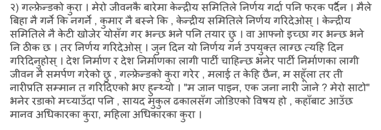 गर्लफ्रेण्डको कुरा मेरो जीवनकै बारेमा केन्द्रीय समितिले निर्णय गर्दा पनि फरक पर्दैन। मैले बिहा नै गर्ने कि नगर्ने? कुमारै बस्ने कि, केन्द्रीय समितिले निर्णय गरिदेओस्। उनले प्रतिवेदनमा उल्लेख गरेका छन्, ‘केन्द्रीय समितिले नै योसँग गर् भन्छ भने पनि तयार छु। वा आफ्नो इच्छा गर भन्छ भने नि ठीक छ । तर निर्णय गरिदेओस। जुन दिन यो निर्णय उपयुक्त लाग्छ त्यही दिन गरिदिनुहोस्।’