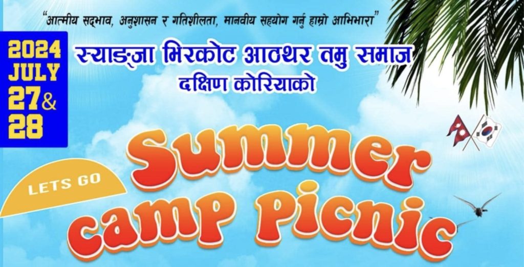 बोम्जन गुरुङ/ विशाल आवाज :कोरियामा स्थापित स्याङ्जा भिर्कोट आर्थर तमु समाजले गर्मी विदाको अवसर पारेर वार्षिक रुपमा आयोजना गर्दै आईरहेको कार्यक्रम यस वर्ष पनि यही जुलाई २७ र २८ तारिक दुई दिने “समर क्याम्प पिकनिक कार्यक्रम २०२४” आयोजना गर्ने भएको छ ।